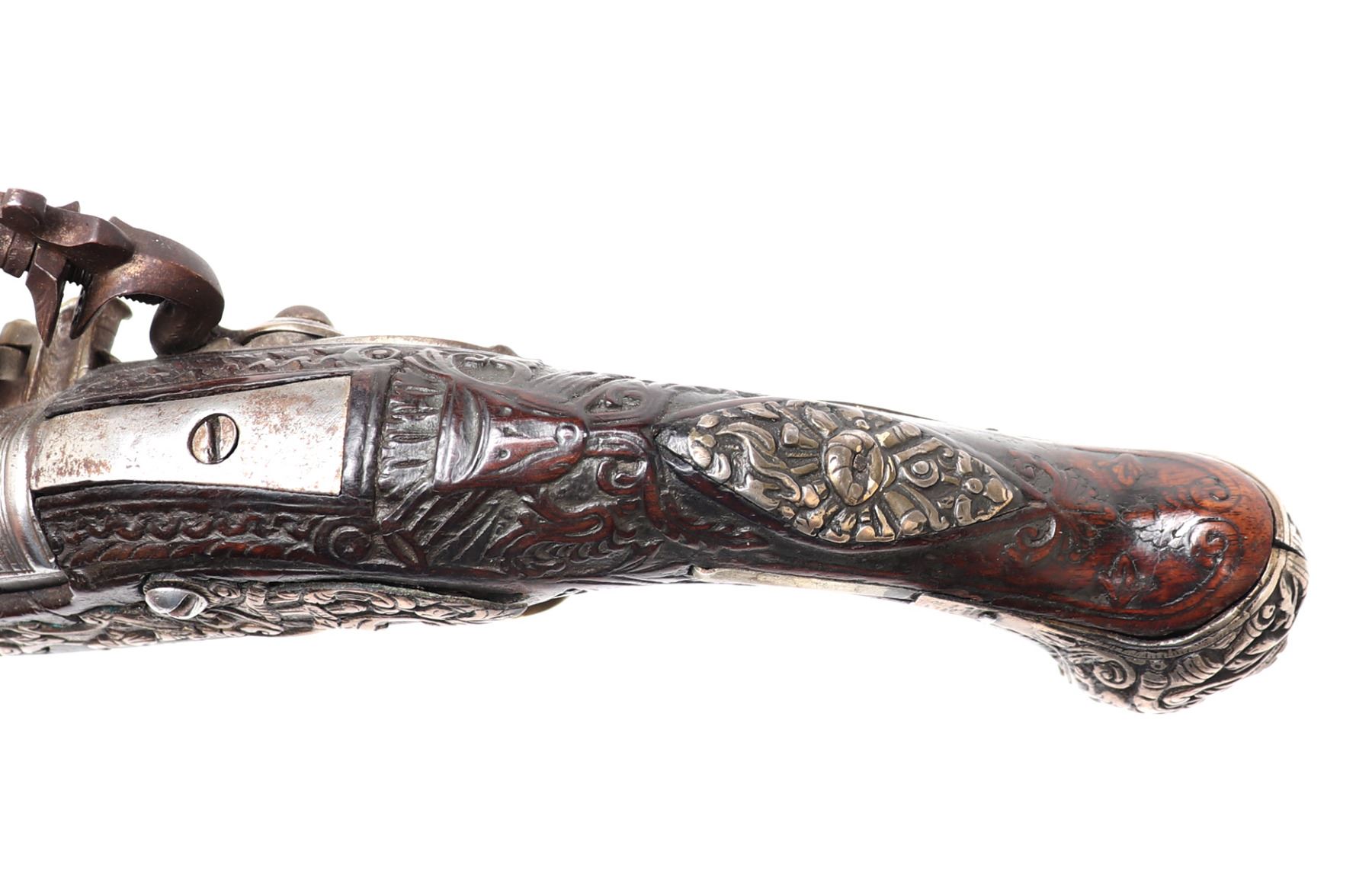Brace of Ornate Silver & Carved Stock Cavalry Pistols, 18th c.