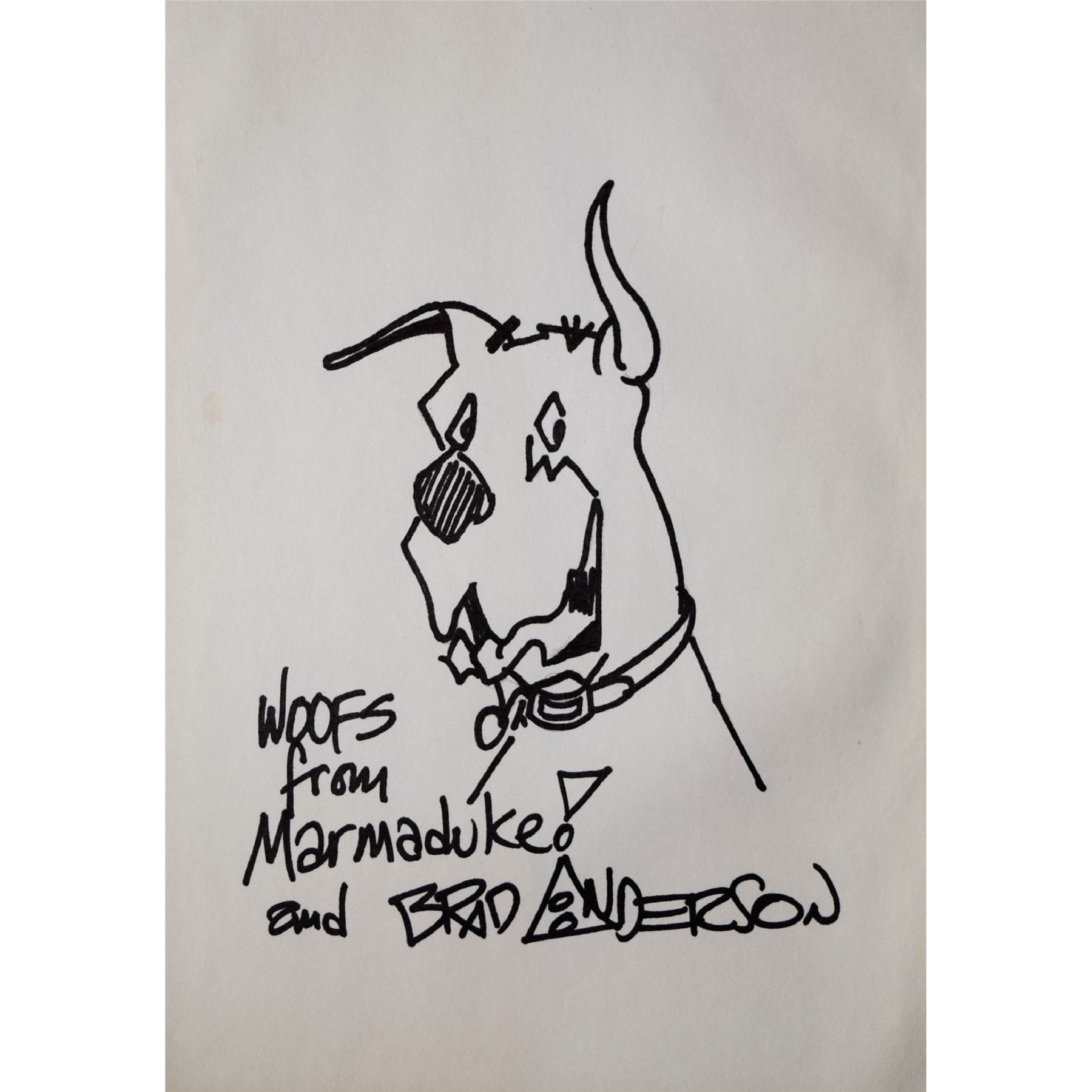 7 1/2 in. by 10 3/4 in. Handdrawn Marmaduke sketch. Signed: Woofs from Marmaduke! And Brad Anderson.
