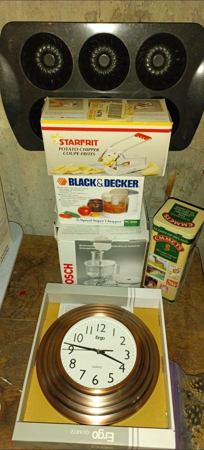 Brand New Potato Chipper, 2-Speed Super Chopper, Bosch Juicer, Ergo Quartz Wall Clock w/Muffin Tray