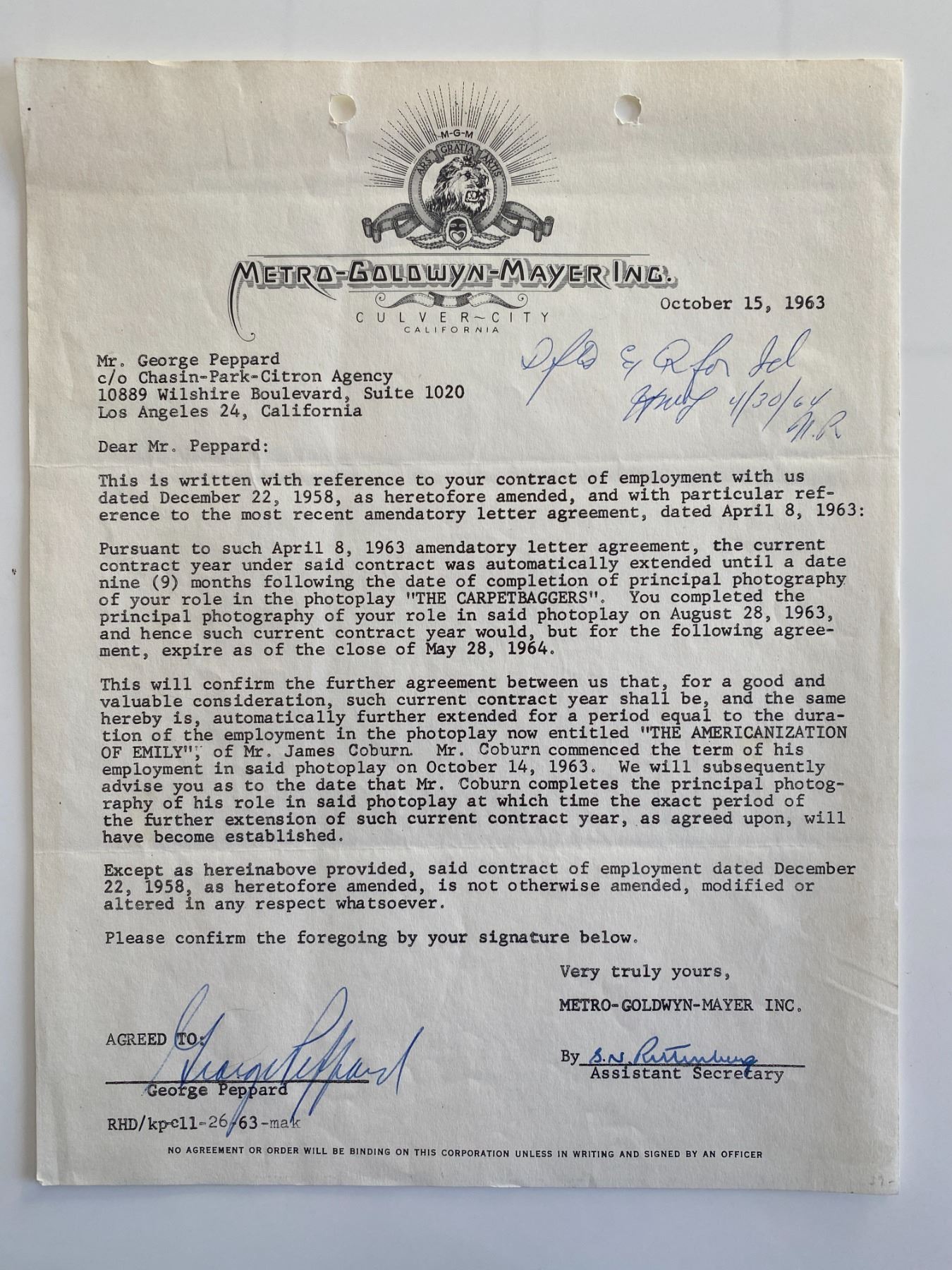George Peppard signed document-Metro Goldwyn-Mayer Inc.-October 15,1963. 9x11 inches