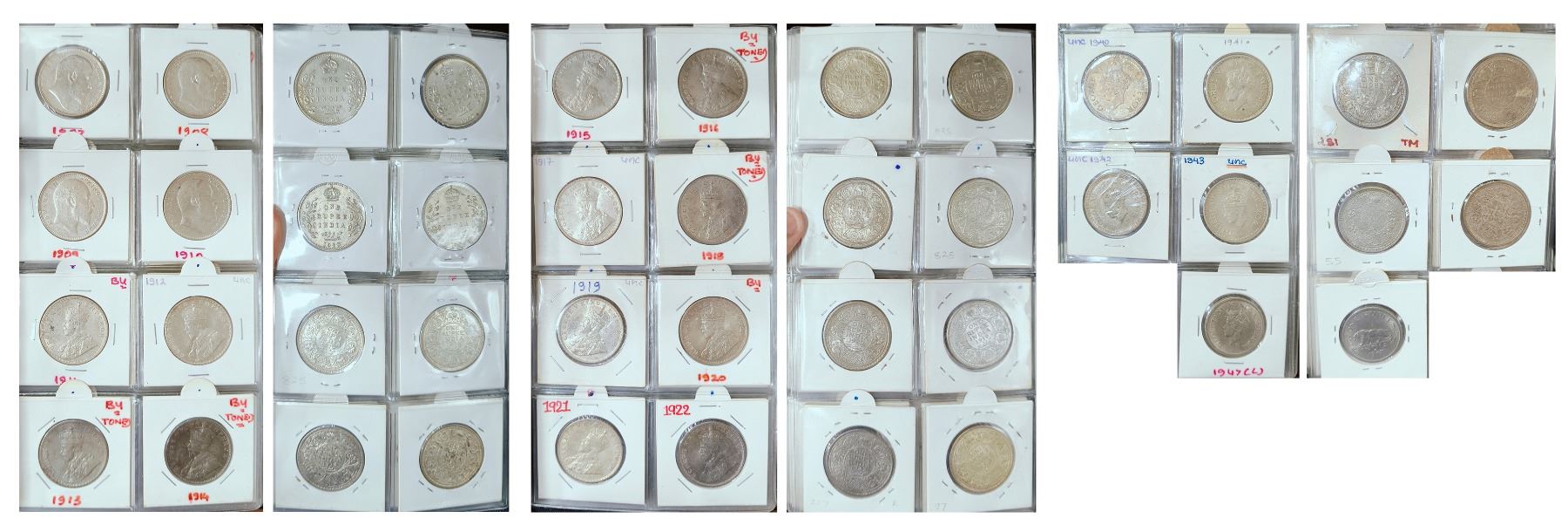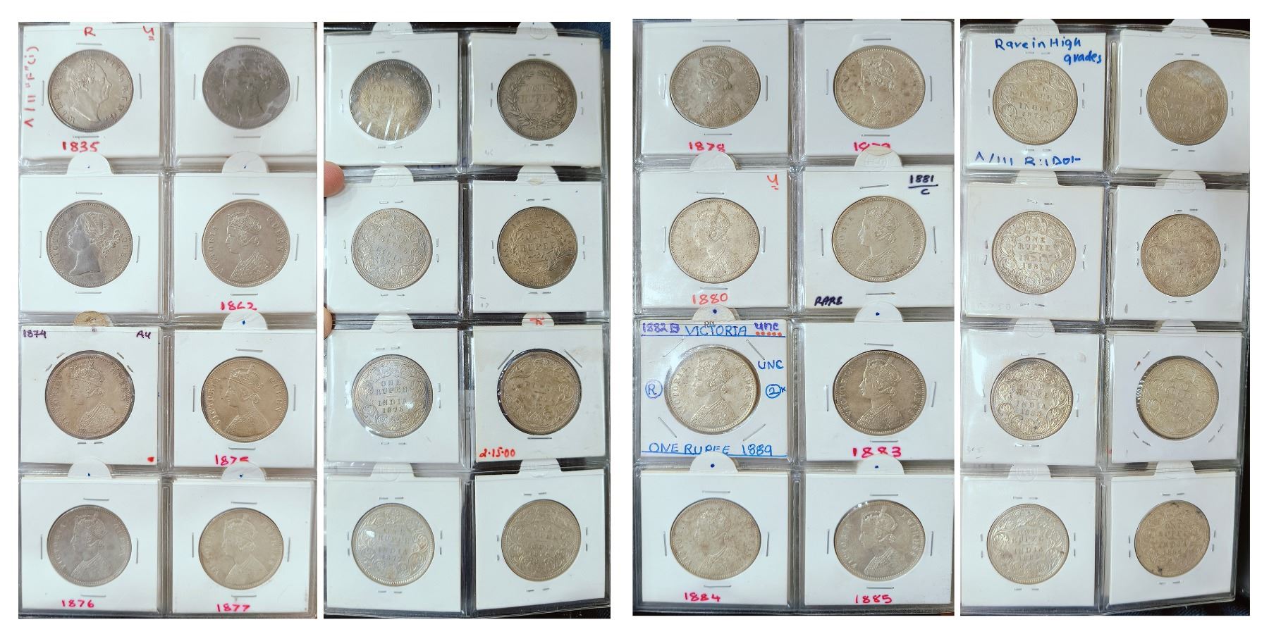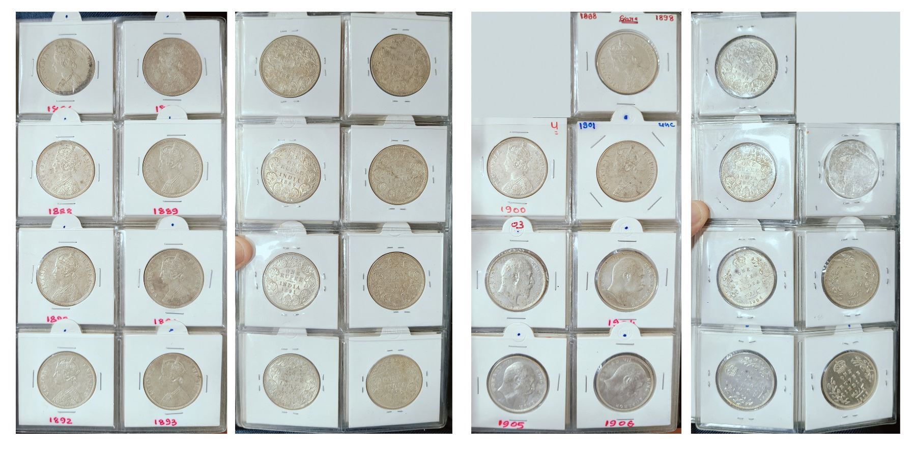 British India: An album of 52 British India rupee of William IV, Victoria Queen C.L./D.L., Victoria Queen/Empress, Edward VII, George V and George VI dated between 1835-1947 (except 1897, 1938, 1939 and 1945); till 1922 all are of silver, 1940-1943 are of half silver and 1947 is of nickel. (52 different variety)