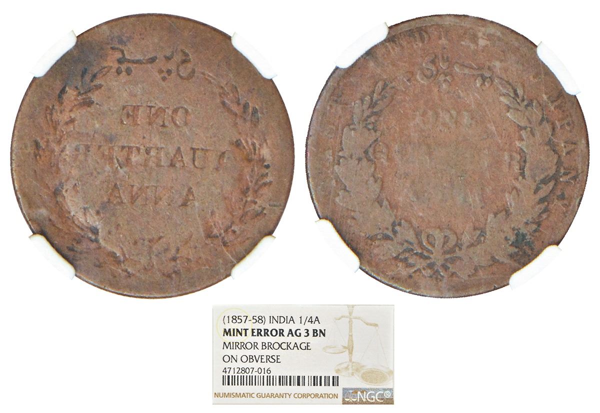 British India: East India Company, copper ¼ anna, error, ND (1857-1858), Birmingham mint, single lea