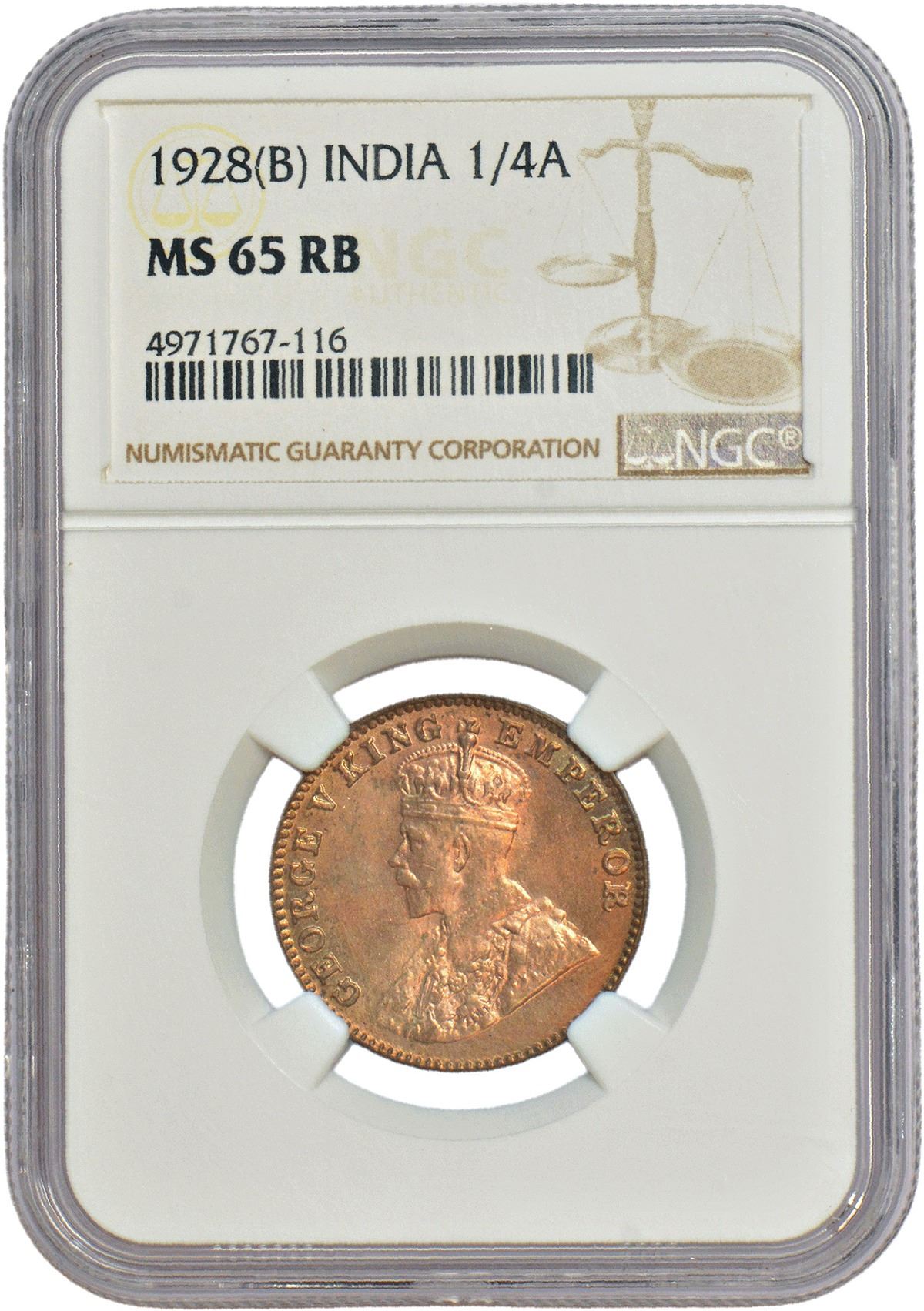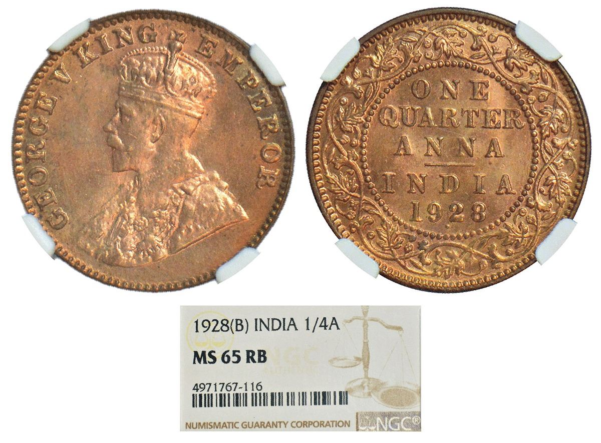 George V, bronze ¼ anna, 1928, Bombay mint, dot, PR 681; GK 1187.