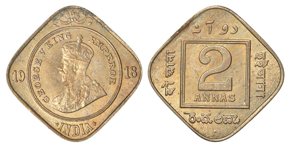 British India: George V, cupro-nickel 2 annas, 1918, Bombay mint, dot, PR 894; GK 1119.