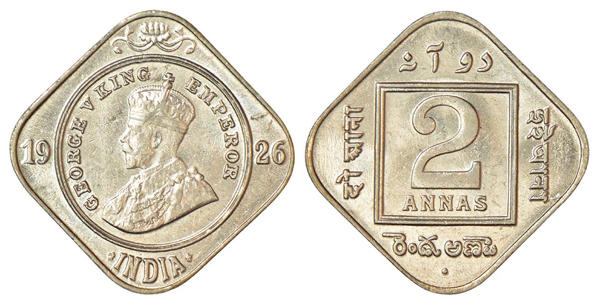 George V, cupro-nickel 2 annas, 1926, Bombay mint, dot, PR 899; GK 1129.