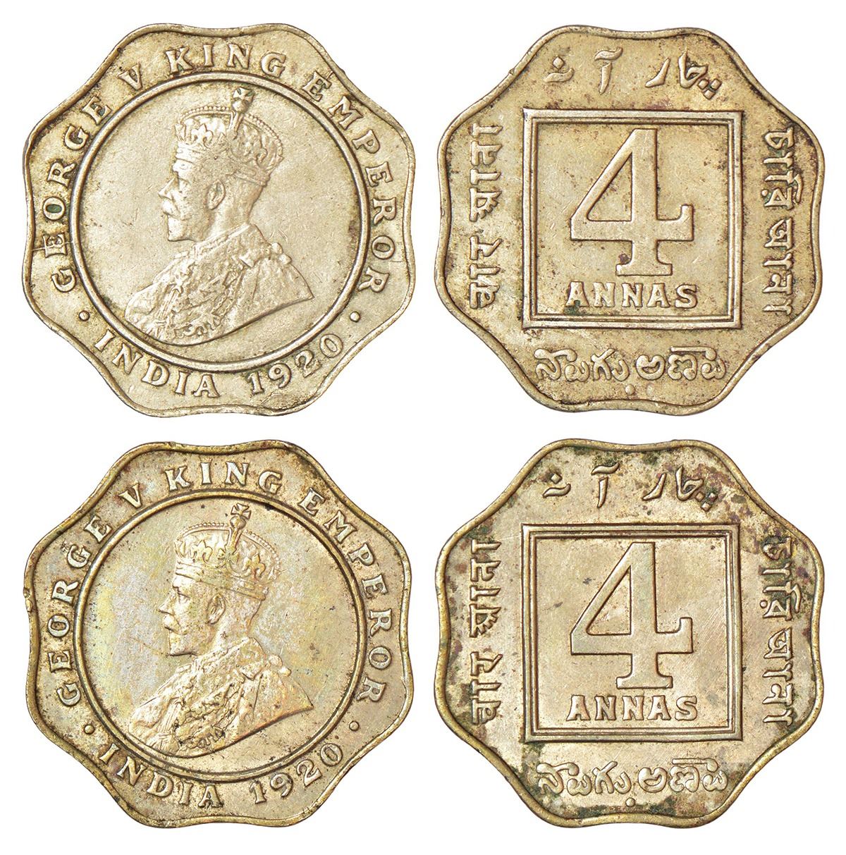 British India: George V, cupro-nickel 4 annas (2), 1920, Bombay mint, dot, PR 878; GK 1104. (2 coins