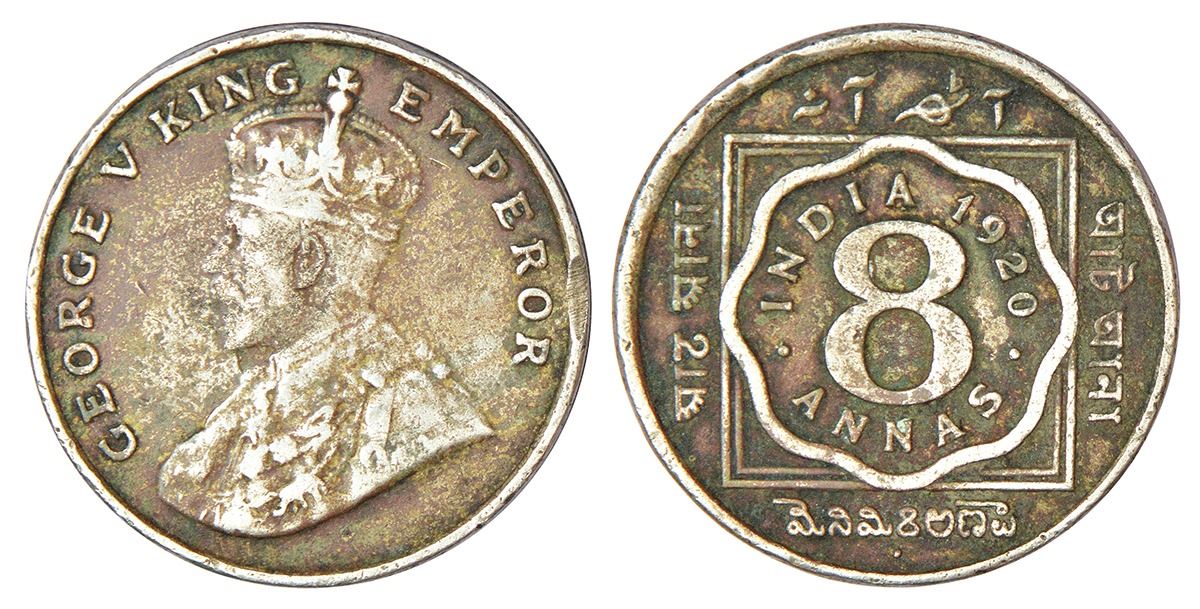 British India: George V, cupro-nickel 8 annas, 1920, Bombay mint, dot, PR 873; GK 1079.