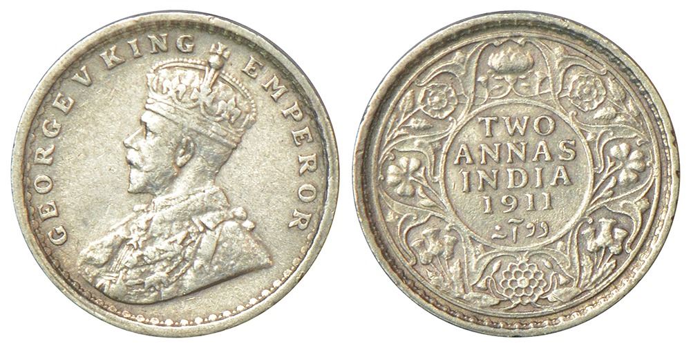 British India, George V, silver 2 anna, AD 1911, Calcutta mint, no dot, PR 564; GK 1107, 1.46g.