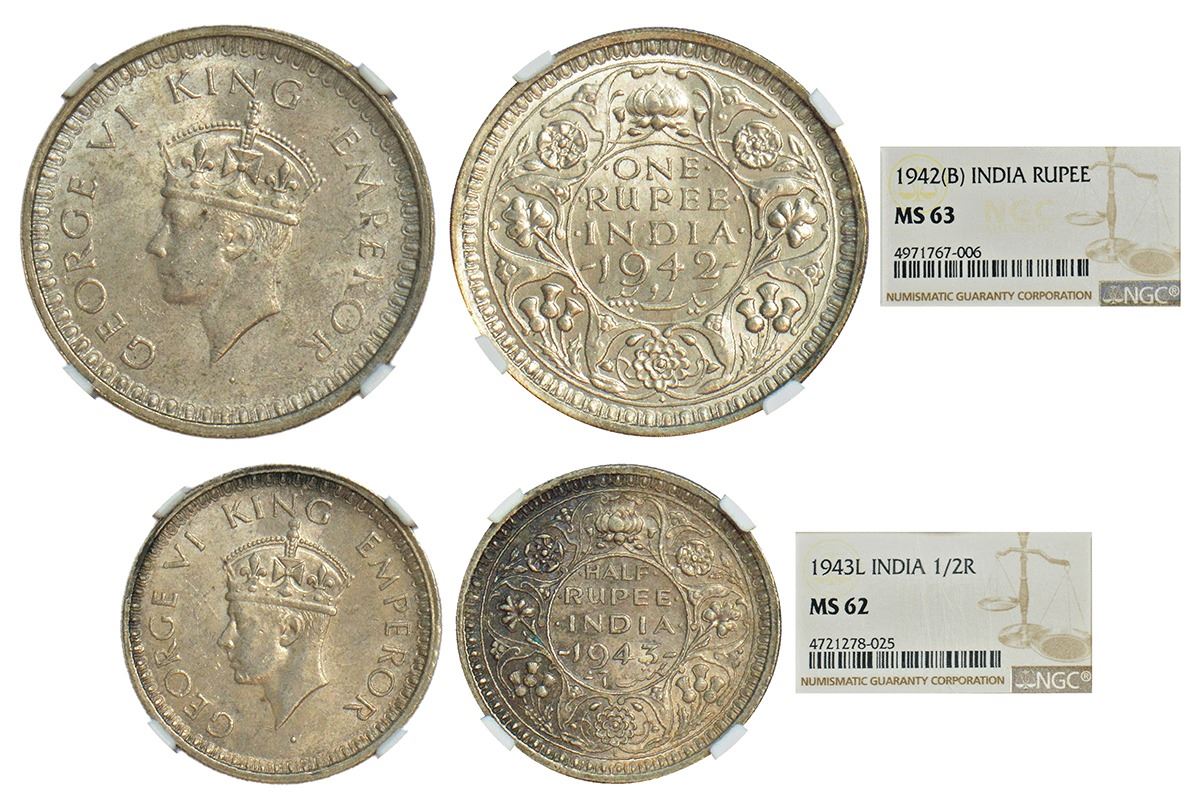 George VI, half silver coins (2), 1x rupee, 1942, Bombay mint, B(a)/II/diamond, GK 1264 and 1x ½ rupee, 1943, Lahore mint, B/II/L raised, GK 1308.