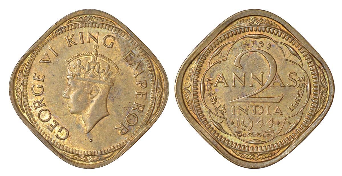 British India: George VI, nickel brass 2 annas, 1944 (small 4), Bombay mint, head type II, PR 920; G