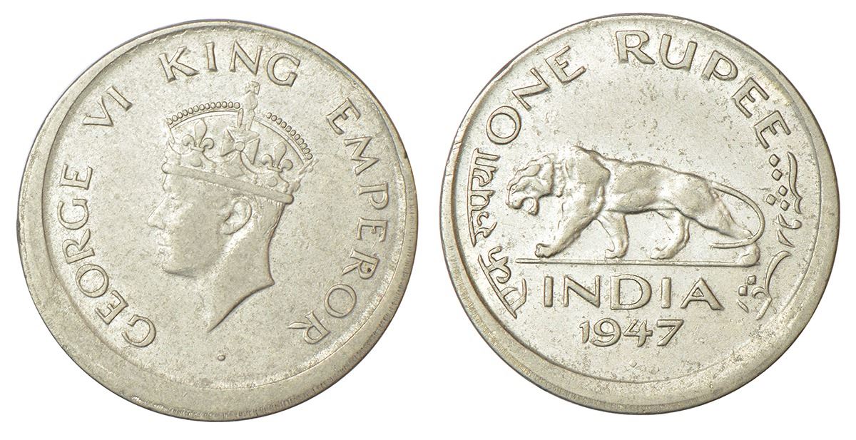 British India: George VI, nickel rupee, error, 1947, Bombay mint, 10% off center on both sides.