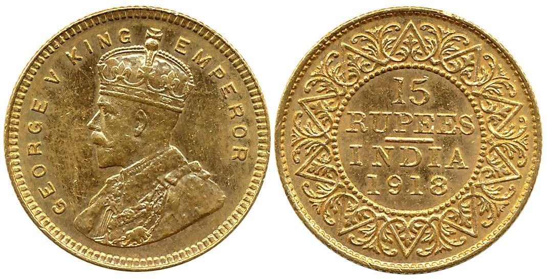 George V, Gold, 15 Rupees, 8.00g, 1918, Bombay Mint, Obv: Crowned & robed bust to left, “B.M.” in relief on the truncation of the shoulder, English legend “GEORGE V KING EMPEROR”, Rev: English legend & date “15/ RUPEES/ INDIA/ 1918” within a beaded circle, outside the circle & within a beaded ring a ten pointed star with entwined scroll- work (Prid# 25). Very fine+ to extremely fine, very rare.