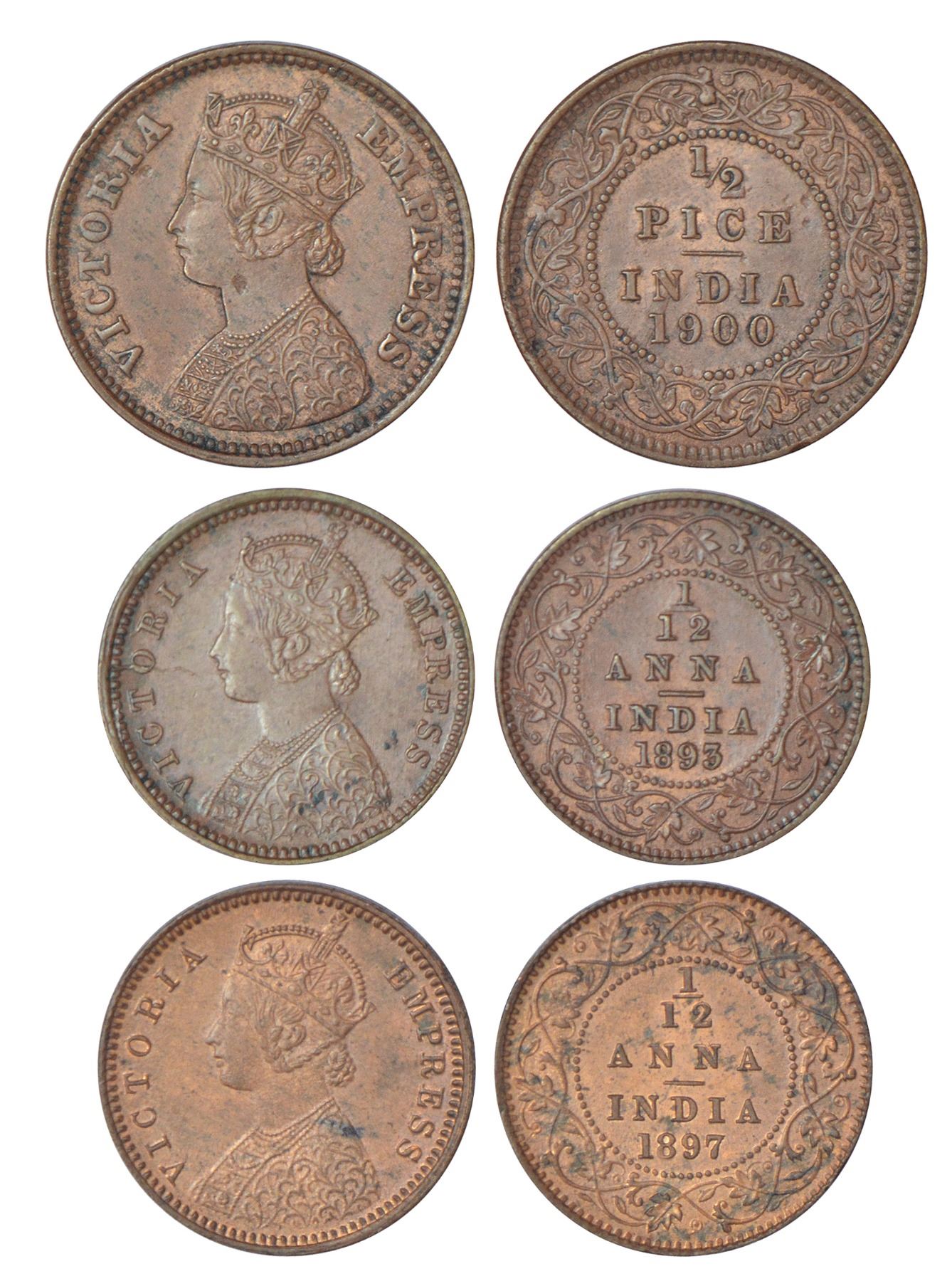 British India, Victoria Empress, copper coins (3), Calcutta mint, 1x ½ pice, AD 1900, PR 733; GK 880, 3.28g, 2x 1/12 anna, AD 1893, PR 798; GK 914, 2.26g, AD 1897, PR 802; GK 918, 2.19g. (3 coins)
