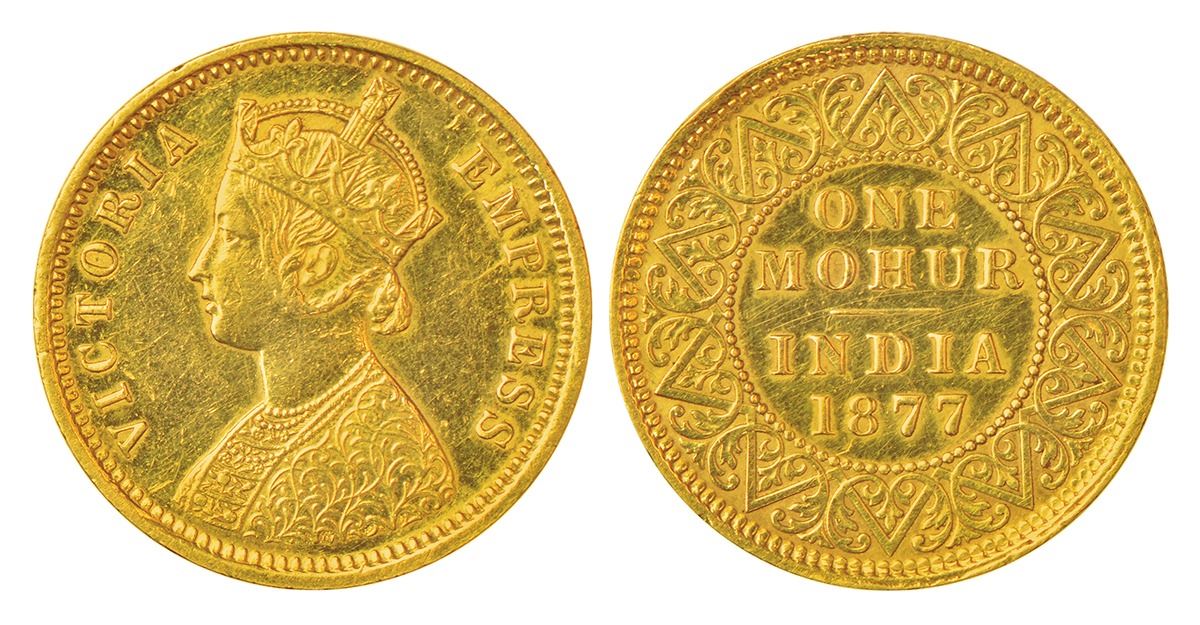 British India: Victoria Empress, gold mohur, 1877, Calcutta mint, two flowers in bottom panel and 'V' in relief, S&W 6.1, PR 14, 11.63g.