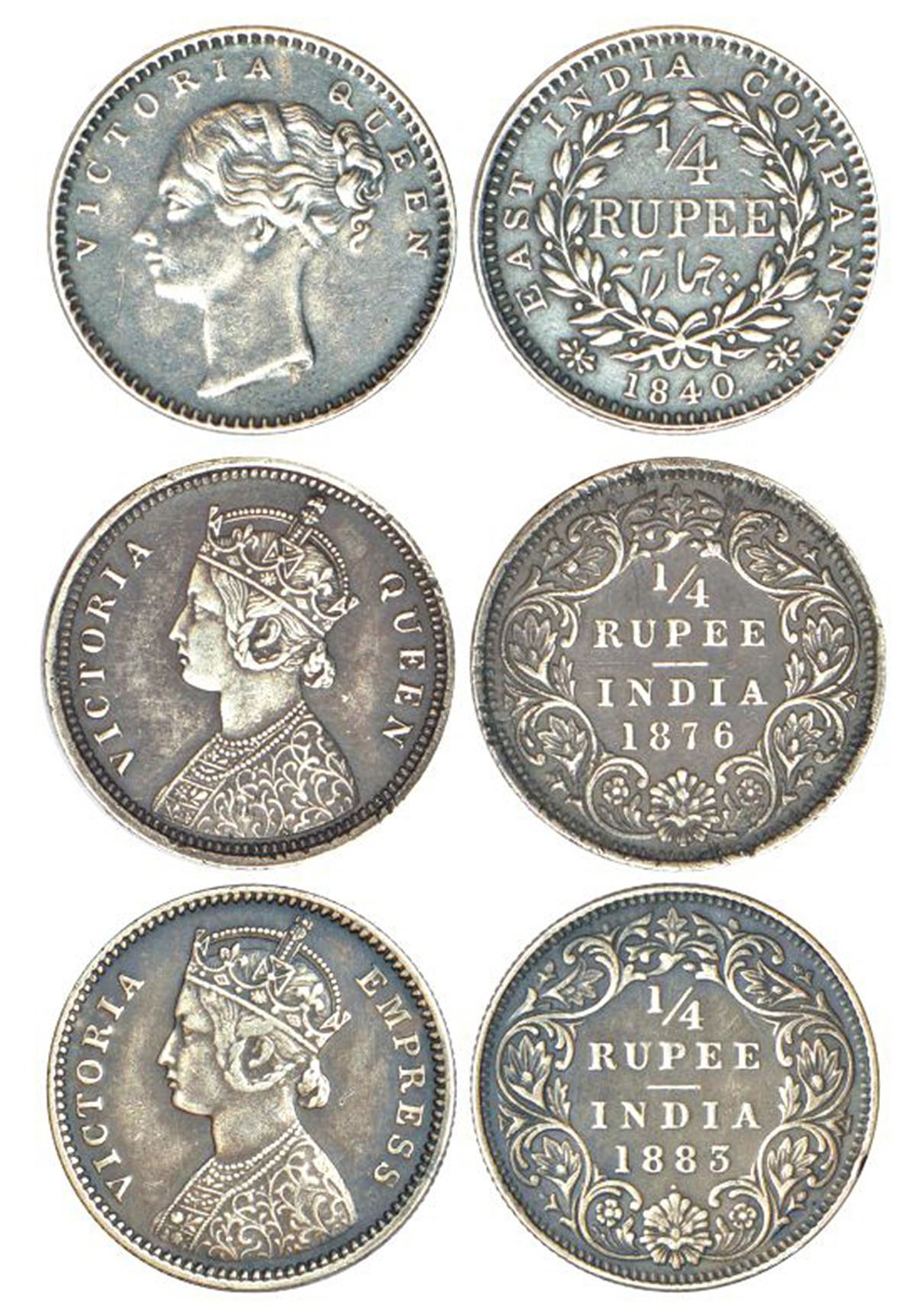 Victoria Queen/Empress, silver ¼ rupee (3), Bombay mint, 1840, continuous legend, English head, 20 berries, PR 102; GK 132-133; 1876, A/I/no mm, PR 407; GK 668 and 1883, B/I/dot, PR 415; GK 689. (3 coins)