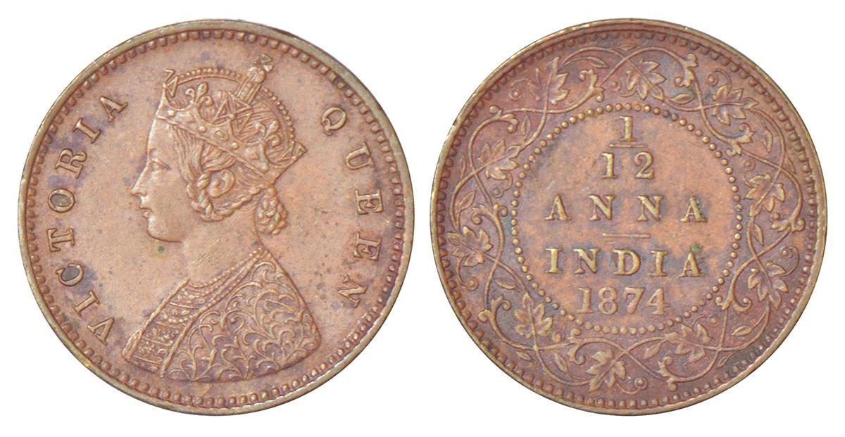 British India: Victoria Queen, copper 1/12 anna, 1874, Calcutta mint, no mint mark, GK 882, 2.24g.