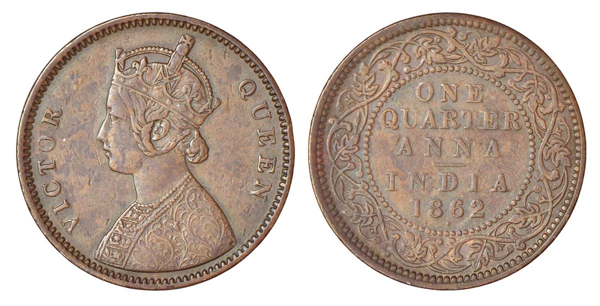 British India: Victoria Queen, copper ¼ anna, 1862, Bombay mint, A/I/dot, PR 603; GK 398, 6.42g.