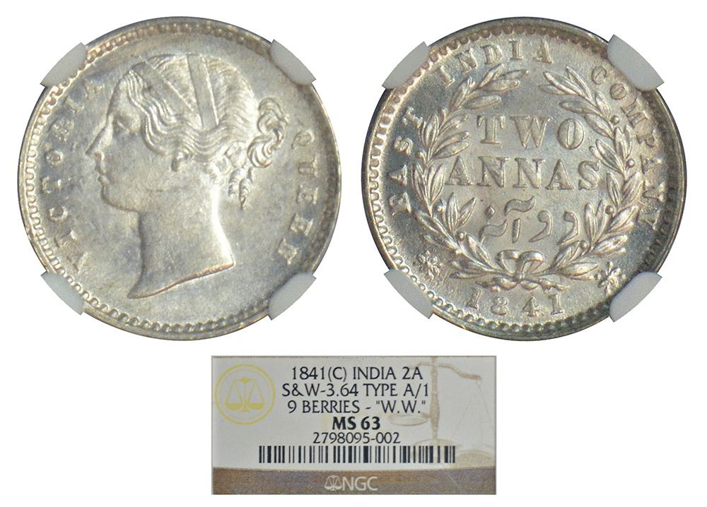 British India, Victoria Queen, divided legend, 2 annas, AD 1841, Calcutta mint, A/II, W.W. raised, 9 berries, PR 123, GK 216, S&W 3.64.