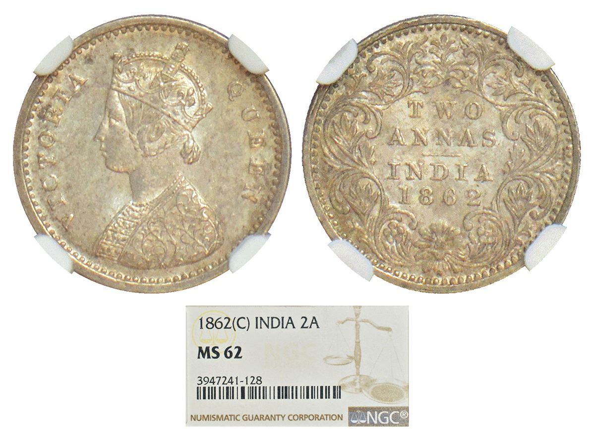 British India: Victoria Queen, silver 2 annas, 1862, Calcutta mint, top three petals of the bottom ornate are not elongated giving it a round shape, PR 485; GK 381.