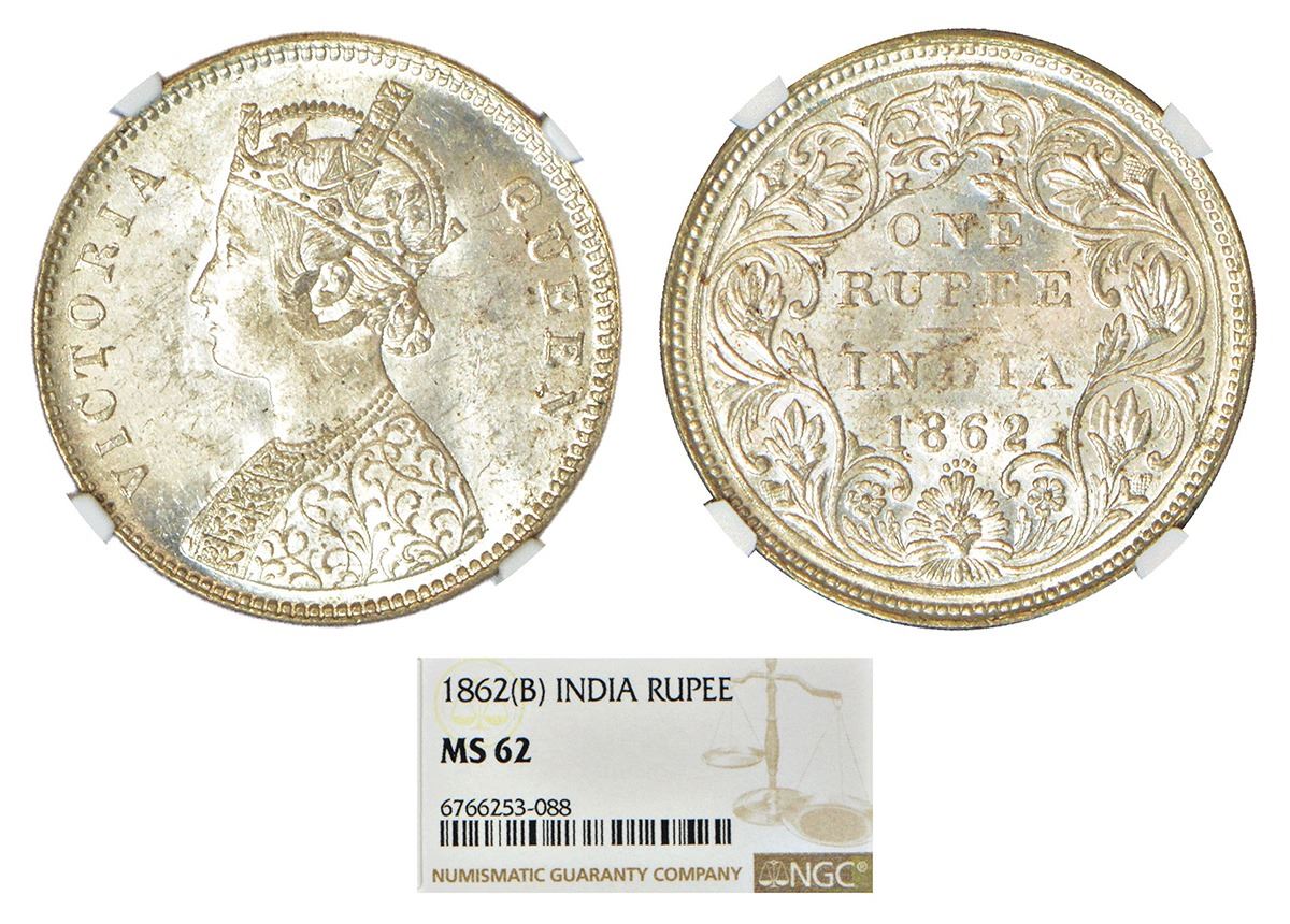 Victoria Queen, silver rupee, 1862, Bombay mint, A/II/0/4, without initial J, PR 79; GK 308.
