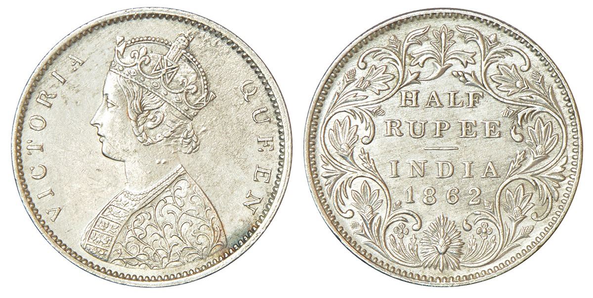 Victoria Queen, silver ½ rupee, 1862, Bombay mint, B1/II, round pearls in the crown, PR 258; GK 371.