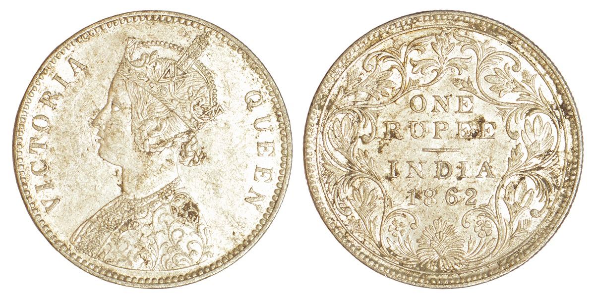 British India: Victoria Queen, silver rupee, 1862, Calcutta mint, A/I/0/0, V in jabot with crescent,