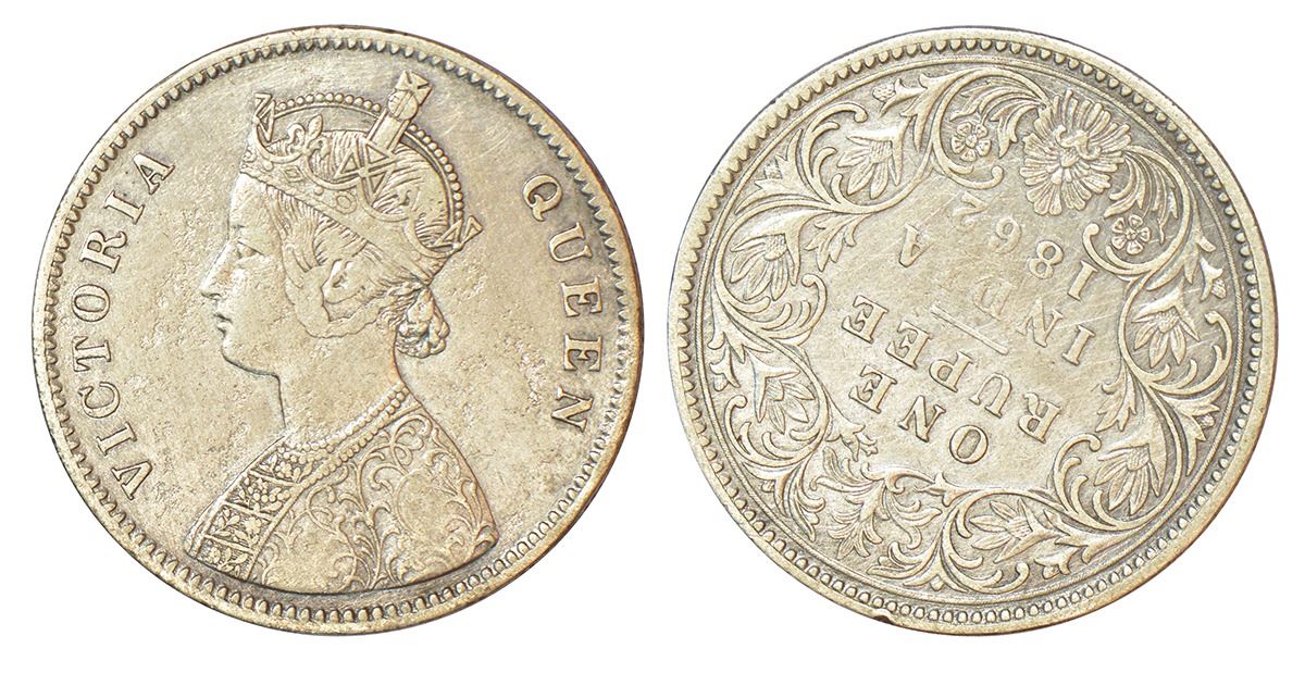 British India: Victoria Queen, silver rupee, 1862, Calcutta mint, A/II/0/0, V in jabot with crescent, PR 66; GK 255, 11.52g. Die-axis around 7 o'clock on reverse.