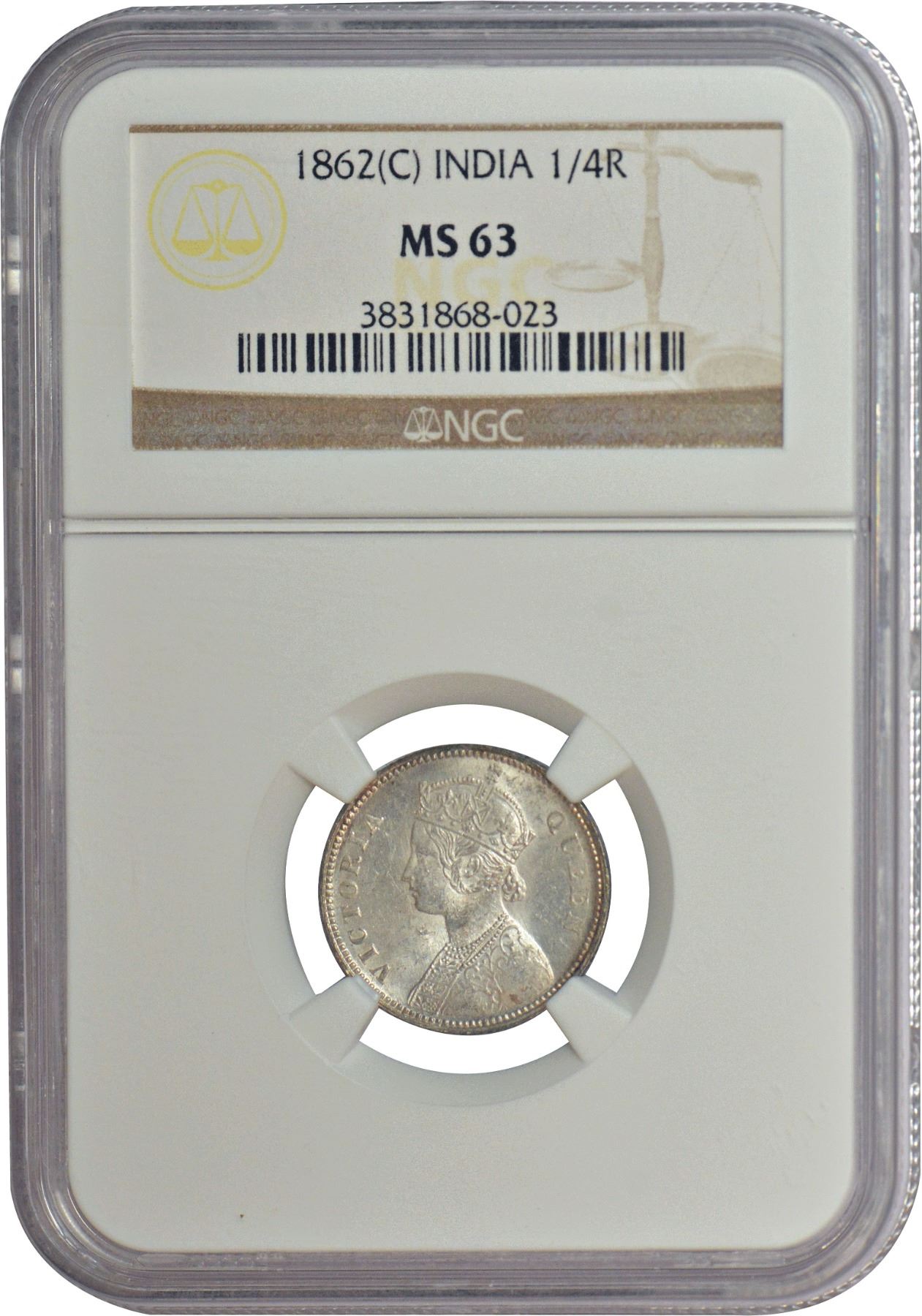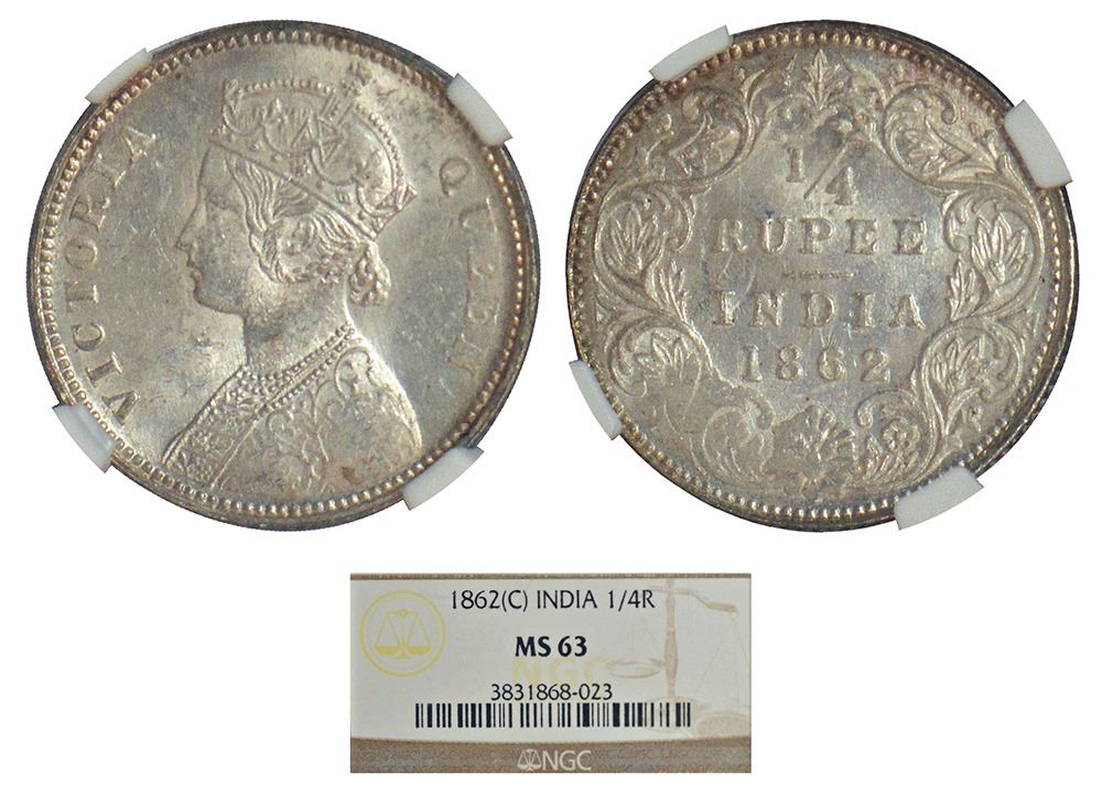 British India, Victoria Queen, silver ¼ rupee, AD 1862, Calcutta mint, A/I, PR 376; GK 375.