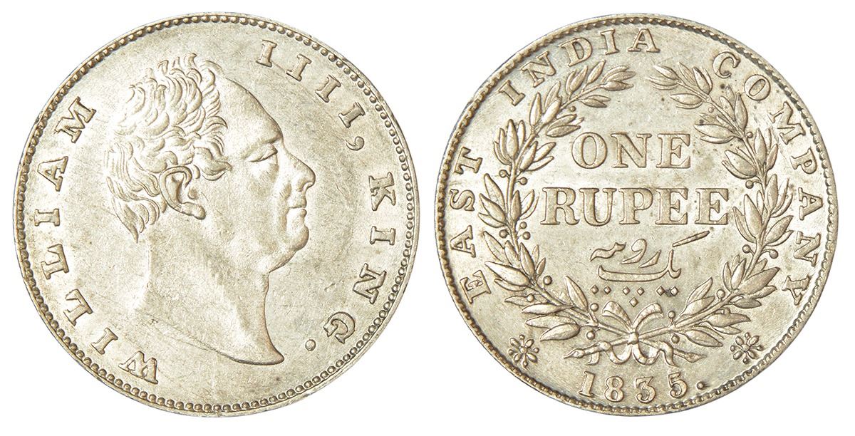 William IV, silver rupee, 1835, Calcutta mint, 'F' incused, A/II(I), two leaves, 19 berries, GK 17.