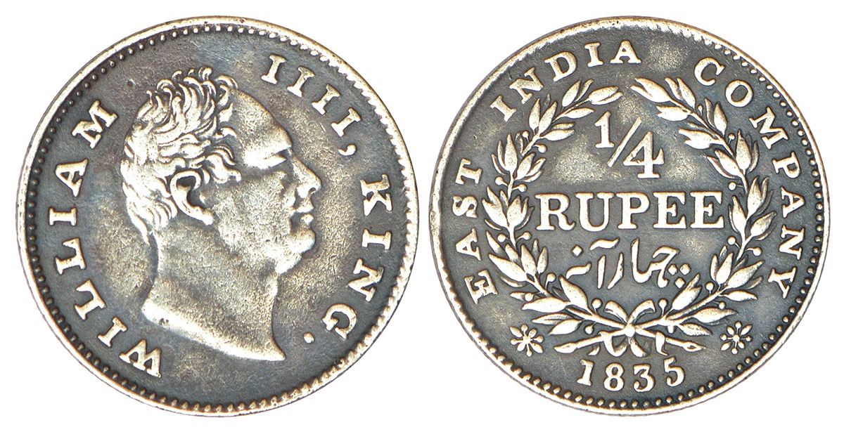 William IV, silver ¼ rupee, 1835, Calcutta mint, 'F' incused, wreath with 19 berries (10L+9R), large date numerals, no dot after date, PR 89.