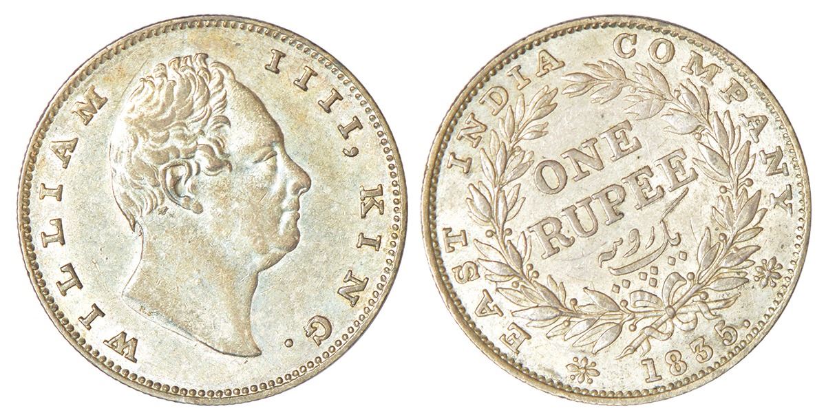 British India: William IV, silver rupee, 1835, Calcutta mint, 'R.S.' incused, B/II(ii), bud leaves, 20 berries, PR 32; GK 4, 11.62g. Die-axis at 11 o'clock on reverse.