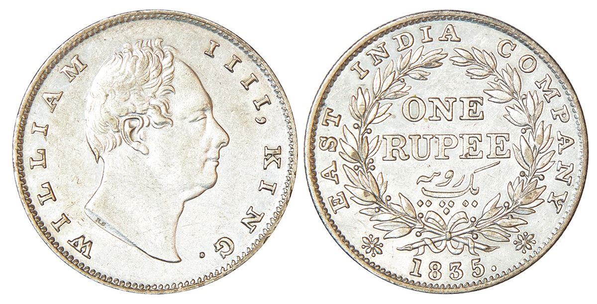 William IV, silver rupee, 1835, Calcutta mint, RS incused, B/II(ii), bud leaves, 20 berries, PR 32; GK 4.