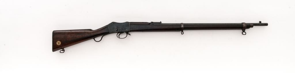 British Mark 1 Martini-Enfield Converted Single Shot Rifle, #253, .303 British cal., 30.2" barrel, blade front sight and adjustable folding leaf rear sight. Marked on right side of receiver with original .450/577 cal. markings "(crown)/V.R./ENFIELD/1880/(lock viewers mark)/III/1.", and on left side with the conversion markings "(crown)/V.R./ENFIELD/1895/(lock viewers mark)/M.E. 303/1". There is a faint Enfield Arsenal roundel on right side of buttstock and file cuts to top of receiver. Rifle was in Australian service and is also marked on right side buttstock "10/09 CMF/T", along with a "sold out of service" opposing arrows stamp. Condition overall is very good with approx. 50% finish remaining on the metal, now showing areas of old rust and patina. Wood is very good showing a few bruises and scratches, along with overall handling marks and darkening to the finish. Action operates smoothly, bore is dark with fair rifling. Est.: $600-$800. (Antique)