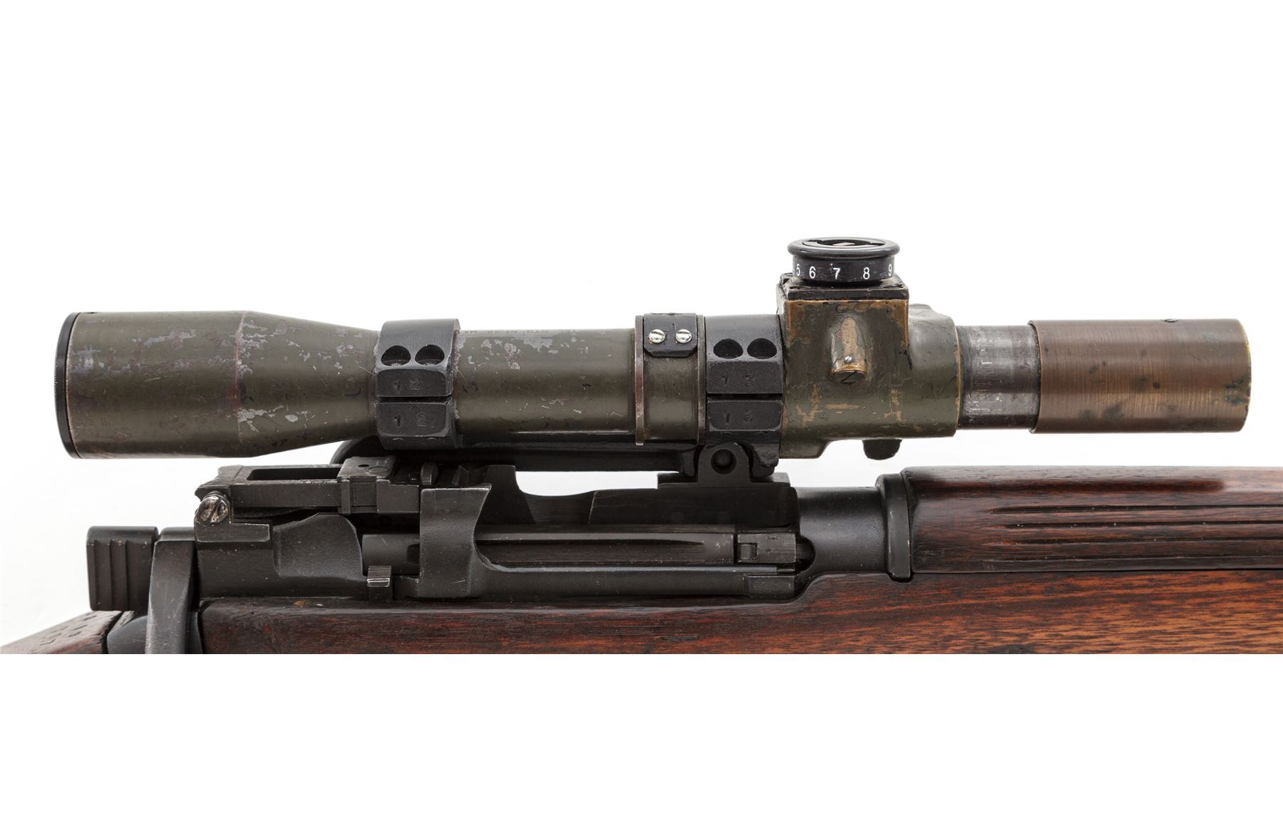 British No. 4 Mk 1 Bolt Action Sniper Rifle, with No.32 Telescope and Transport Box, #AU9027, .303 British cal., 25.2'' barrel, blued finish, hardwood stock, blade front sight with protecting ears and folding leaf rear sight with aperture removed. Marked on left side of action body ''47C(faint)/1944/TR'' target range stamp. Right side action lug has vertical ''S'' stamp. View stamps on both sides of bolt channel are unreadable. Tall ''T'' stamp above ejector screw. #1 bolt head. Serial number on body and matching number on bolt handle have been applied recently in modern font. Matching serial number on forend is in normal No. 4 style across the grain. Matching number stamped on magazine. Forend has a transverse reinforcing bolt installed. Buttstock has no markings on underside. Both scope pads are in place and each screw has a single stake mark. Top flat of buttstock has a recently applied serial number that matches the scope's serial number. Forend has an arsenal repair and the cheekpiece is cracked. Condition overall is very good with most of the partial refinish remaining on the metal. Wood has been sanded and refinished at some point and has a dark appearance with old handling marks. Action is smooth, bright bore is very good with very good rifling. Century Arms import stamp on underside of barrel. Scope is marked ''TEL.STG No 32 Mk 1 H.B.M.Co. OS.466A REGo No5313''. Condition overall is very good as re-conditioned by author and armourer Peter Laidler and includes an invoice for work performed along with a cover letter. Optics are clear. Includes leather lens protector. Mounting bracket appears to be a modern reproduction and is in excellent condition. The empty wooden No. 15 Mk 1 transport box has been re-conditioned to like new and is in excellent condition. Est.: $1,500-$2,500. (C&R)