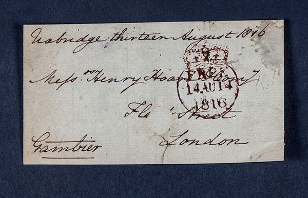 [british Royal Navy] Admiral of the Fleet James Gambier, 1st Baron Gambier (1756-1833) Admiral of the Royal Navy; served as Governor of Newfoundland, and as a Lord of the Admiralty. After the Battle of the Basque Roads (1809), Captain Lord Cockrane accused Gambier of being reluctant to press the attack; Gambier demanded a court martial and was exonerated. In 1813 he was part of the team negotiating the Treaty of Ghent, ending the War of 1812 between Britain and the United States. Address panel free franked "Gambier" 14 August 1816. Red stamped crown-shaped cancellation.