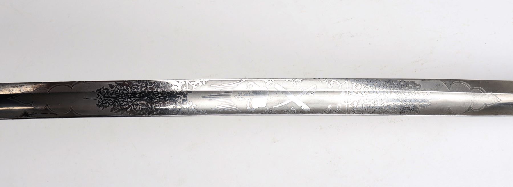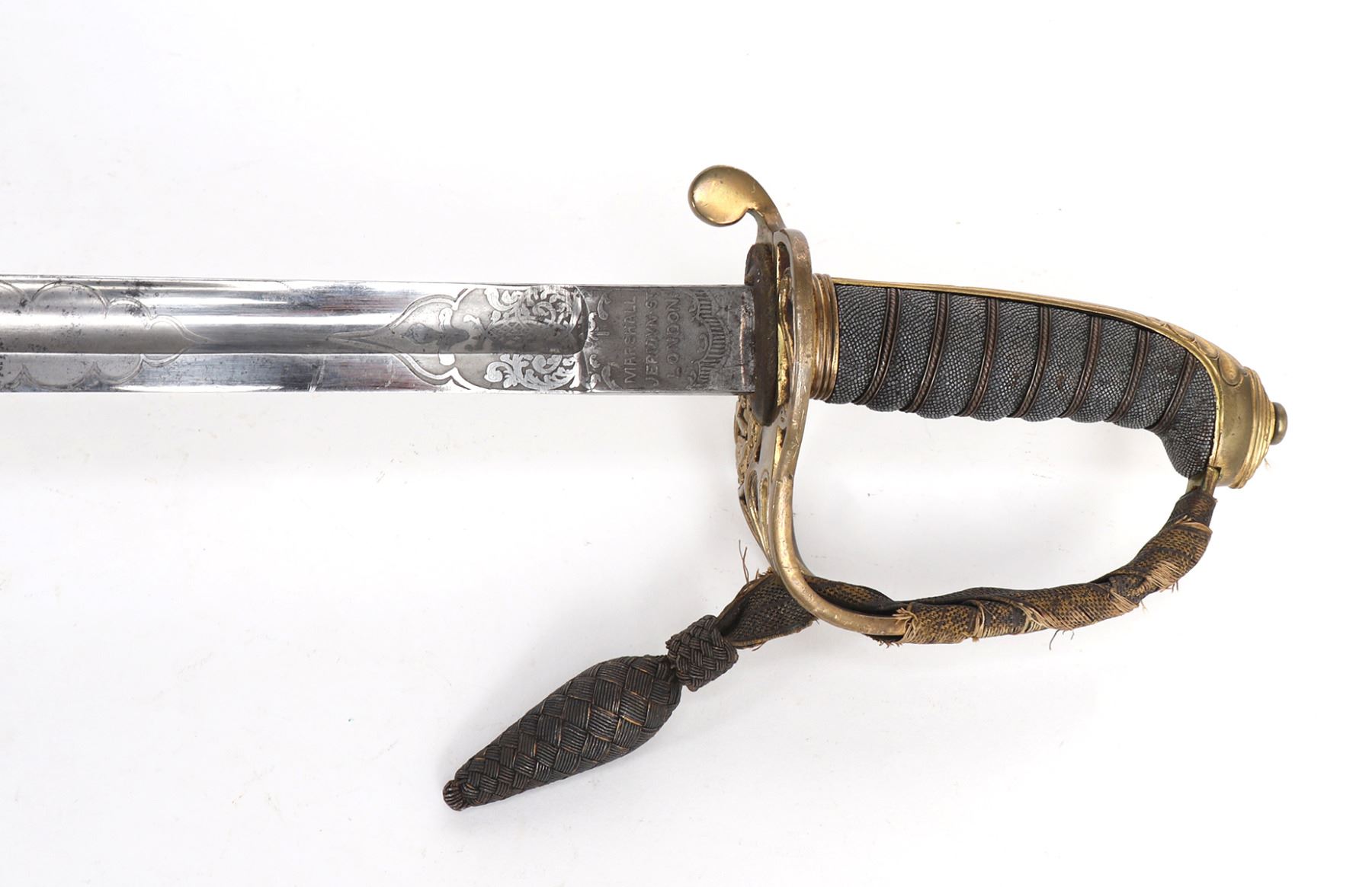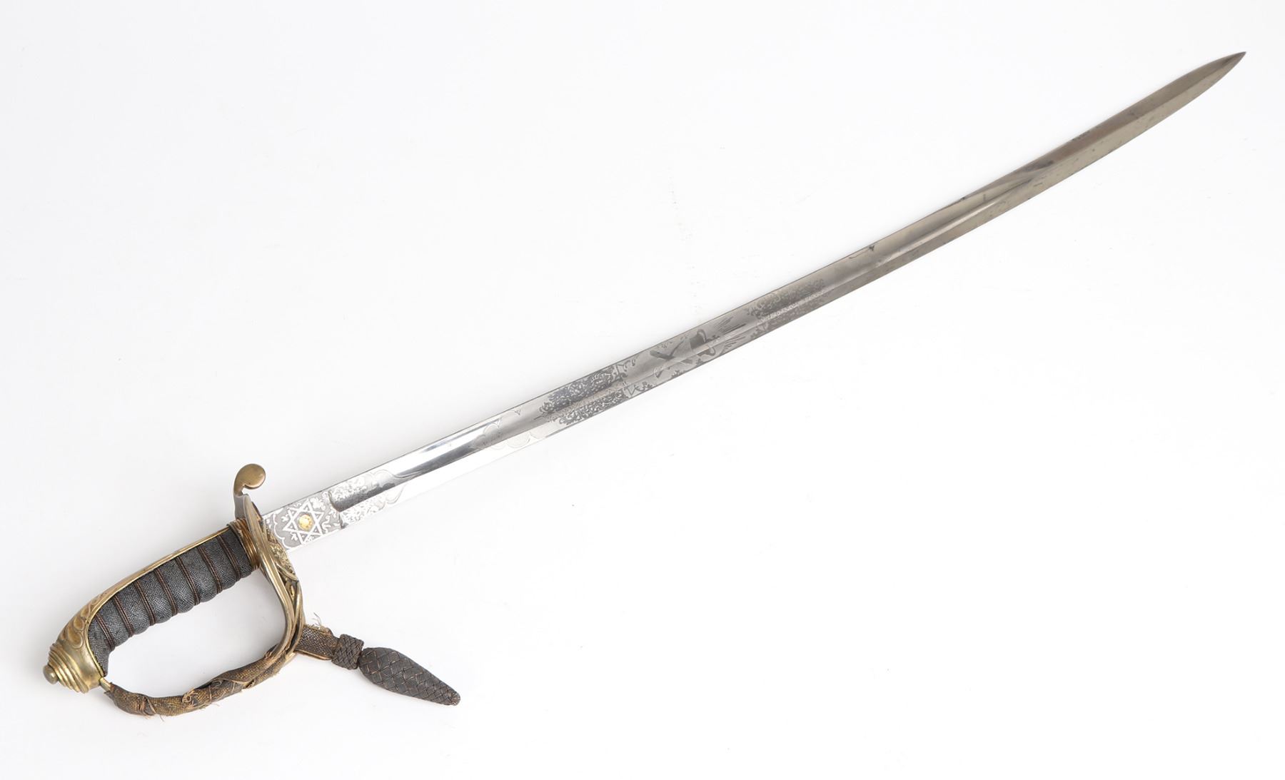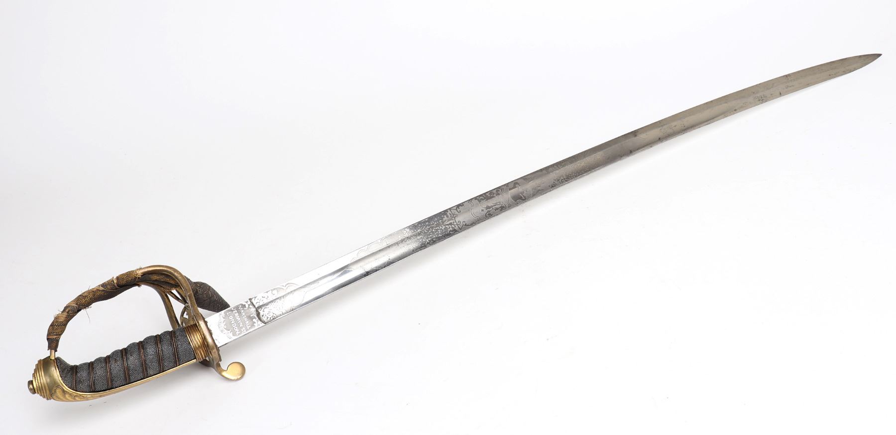British General officer's sword, 1860 – 1901. Reverse ricasso signed: MARSHALL JERMYN ST. LONDON., double acid etched curved blade with wide fuller on each side. Queen’s Crown over VR Cypher (Victoria Regina) and scrolled leaf ornament etched on one side (within Arabesque panel) and on the other side with Queen’s Crown over crossed baton over sword (insignia of British General Officers). Gold (or golden) Proof Mark within the etched Damascus Star on the obverse ricasso. Gothic six-branch knuckle bow, sharkskin wrapped wood grip with brass retaining wires intact. Stepped oval pommel cap. Complete with acorn-shaped bullion thread sword knot. Very good overall, noting excellent blade, and some dents in the scabbard.