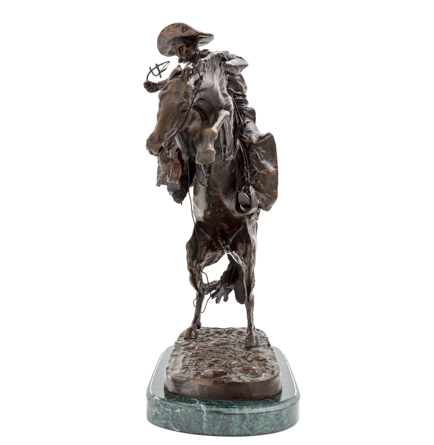 Bronze recast of Frederic Remington's ''Bronco Buster'', on marble base, approx. 22'' tall, in excellent condition showing fine detail. Frederic Remington's first bronze, of which a casting has resided in the White House since Theodore Roosevelt's presidency. Est.: $600-$800.