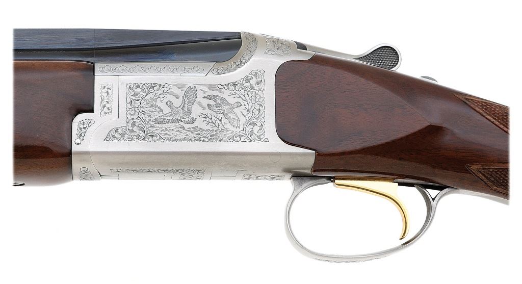 serial #38782NVM83, 410 bore, 26'' ventilated rib Invector Plus choked barrels with bright excellent bores. The barrels retain 98% original blue and the balance of metal surfaces retain a similar amount of original coin gray finish with some scattered tiny specks of fine oxidation staining and the trigger retains nearly all of its gold finish. The frame is embellished with handsome foliate scroll and game scene engraving with quail and grouse scenes. The checkered straight grip high gloss stock and schnabel tip forend rate excellent with a few minor handling marks and a 14 1/4'' length of pull. This 1995 manufactured handsome small bore features a single silver bead front sight, single selective trigger, non-automatic safety and robust ejectors. Included is a manual and pair of Invector Plus skeet chokes. (10B11788-1) {MODERN} (1800/2200)