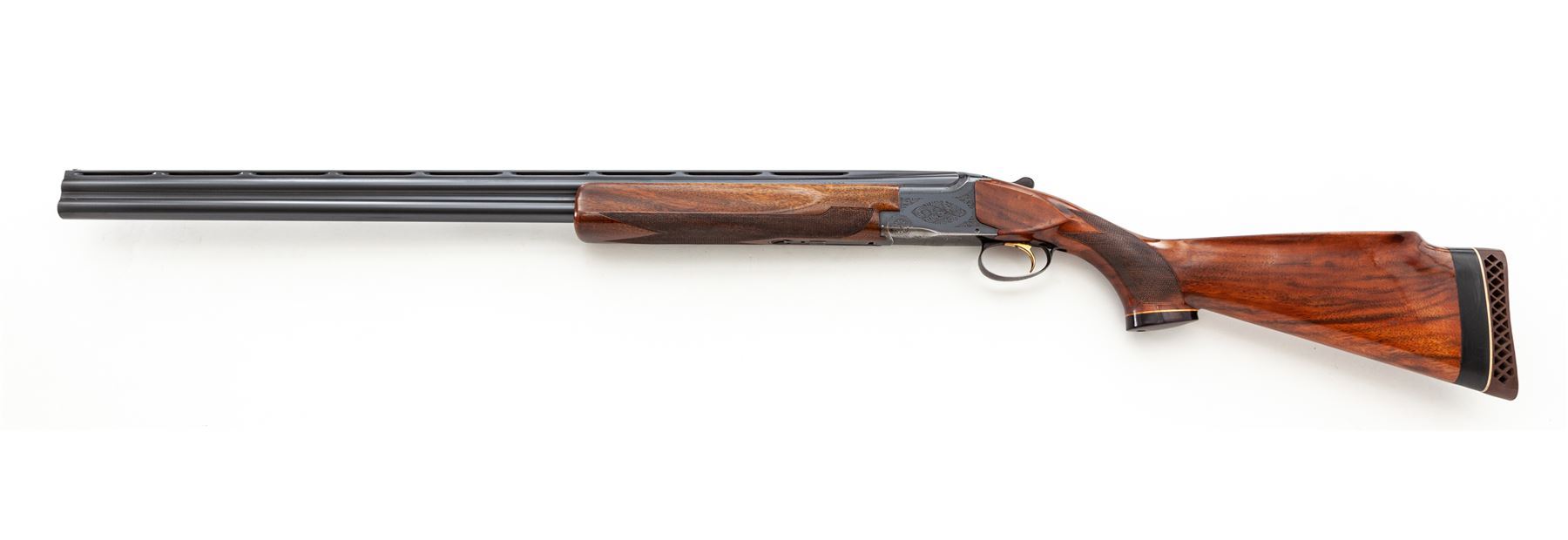 Browning Superposed Lightning Trap Model Over/Under Shotgun, with custom buttstock, #6068S72. 12 ga. 32'' barrels have a wide ''Broadway'' ventilated rib, 2-3/4'' chambers, and are choked IM./Full. The superposed boxlock action features a single selective trigger, non-auto safety and auto ejectors. The full beavertail forend is standard Browning, but the pistol grip/Monte Carlo buttstock is custom made, apparently for a left-handed shooter that must shoot right-eyed. Buttstock has a full Wundhammer pistol grip with custom wood grip cap, rollover cheekpiece, and a 15-3/4'' length of pull to a Pachmayr Trap butt pad. Gun mfg'd 1972. Condition is very good as modified, with few marks to wood or metal, except for carry wear on bottom of receiver. Action has been used a lot and readily opens, but still locks tight upon closing; trigger and ejectors function correctly, bores are bright. Est.: $500-$1,000. (Modern)