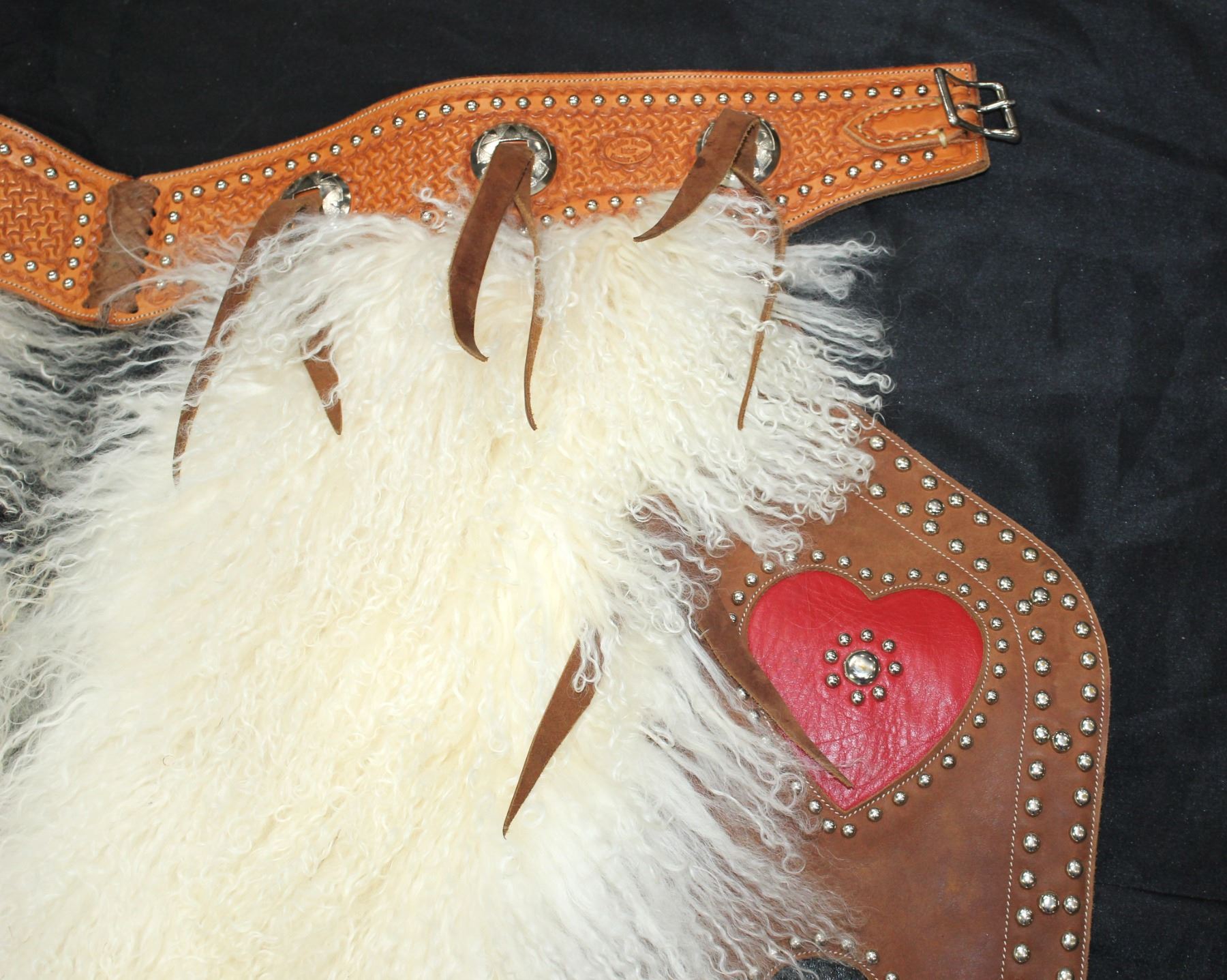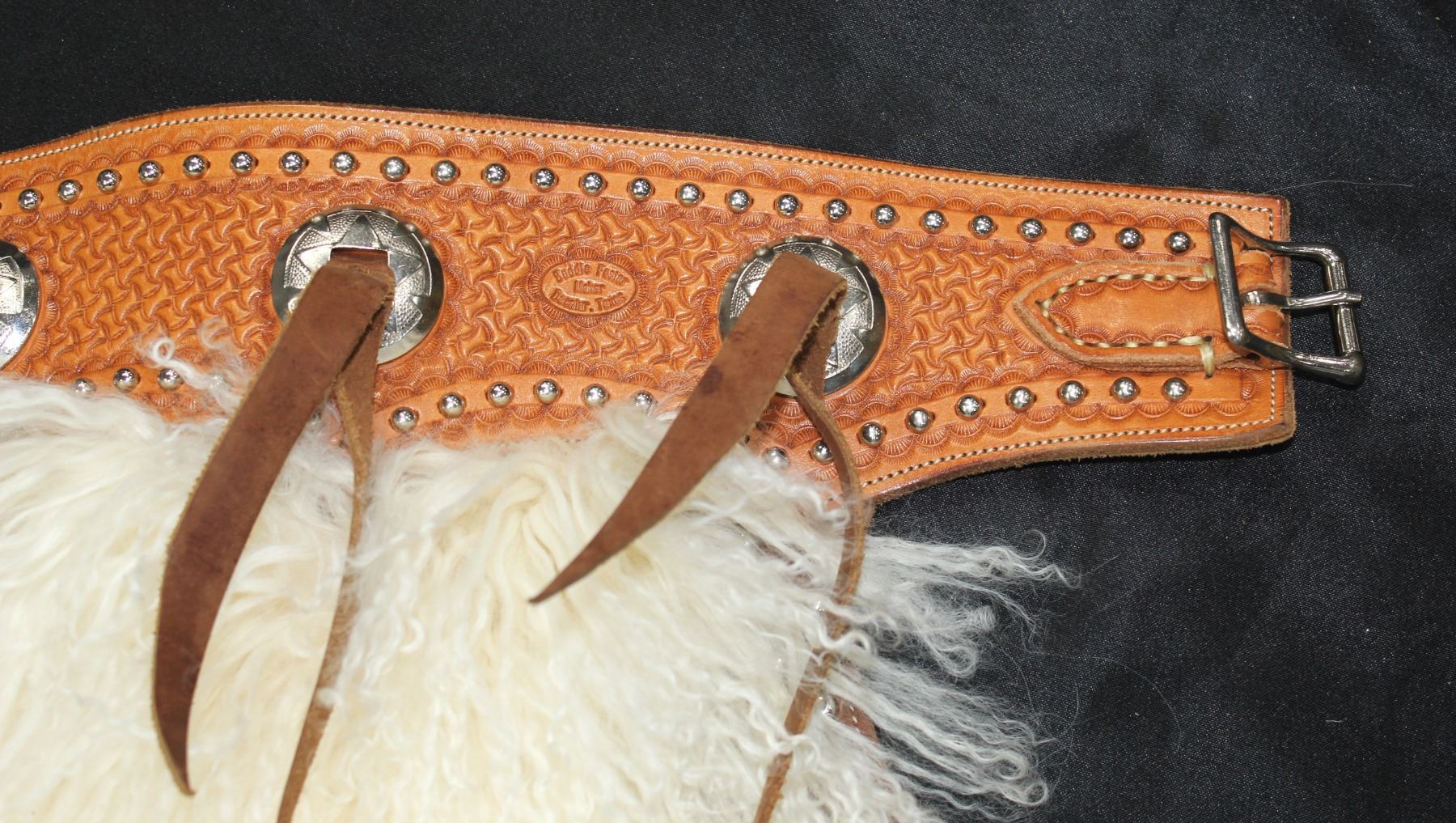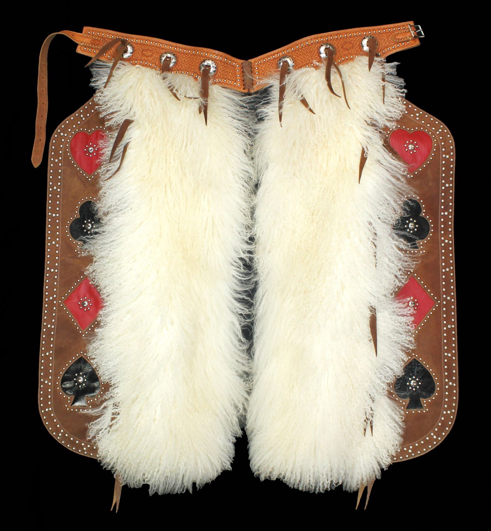 An amazing pair of batwing chaps from our beloved Buddy Foster. Displaying his terrific craftsmanship, with a combined design of white angora and oversized studded card suit wings, topped by his classicly basket stamped belt.