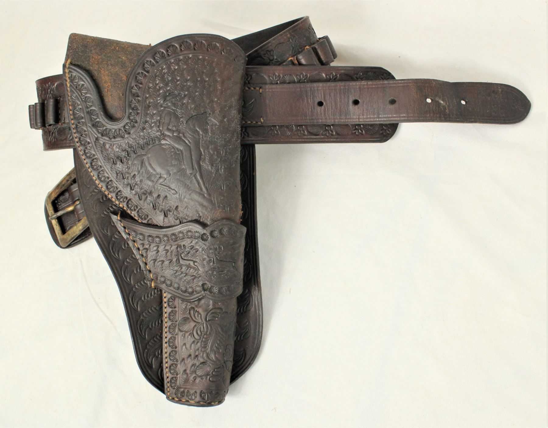Finely tooled belt and single loop holster for a 7 1/2" Colt single action, with a motif of Buffalo Bill horseback, marked for 38cal, and showing beautiful rich color.