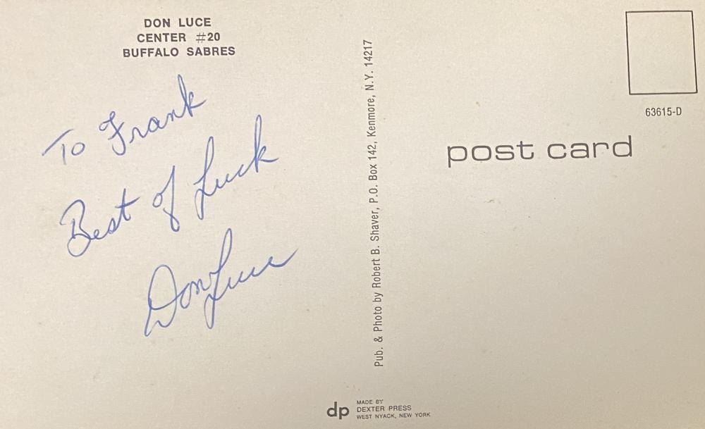 Buffalo Sabres Don Luce signed postcard. 4x6 inches