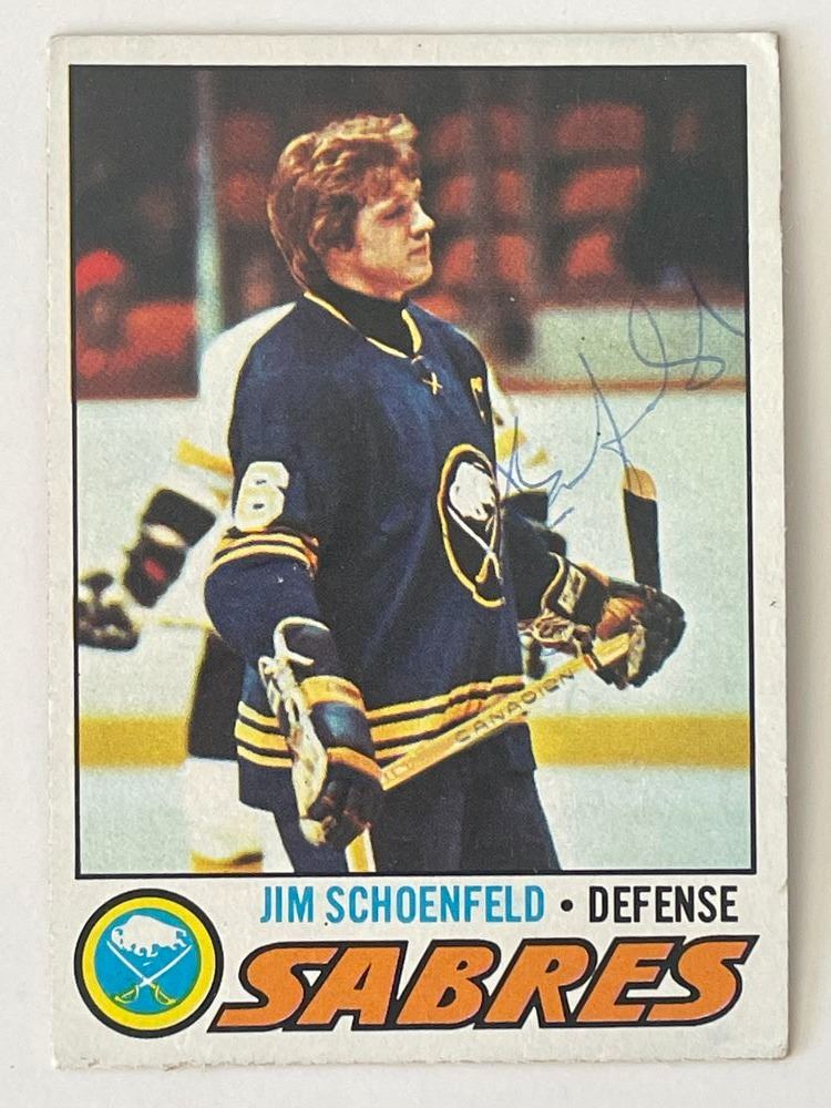 Buffalo Sabres Jim Schoenfeld 1977 Tops #108 signed trading card. 2x3 inches