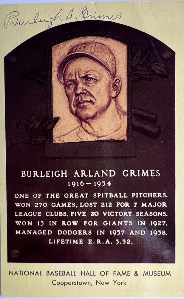 Burleigh Grimes signed HOF postcard. 3x5 inches