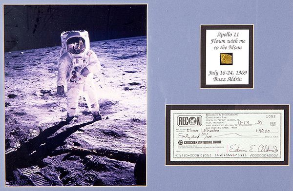 Buzz Aldrin Autograph and Flown "Kapton" Heat Shield. A beautiful presentation piece combining 3 items related to Apollo 11, all double matted. An 8 x 10" portrait of Buzz Aldrin on the Lunar surface together with Aldrin�s autograph on a cancelled check and a piece of the Command Module Kapton foil. The Kapton polymide tape was part of the spacecraft�s thermal protection subsystem and as noted "was flown to the moon". This piece was removed from Command Module, Columbia after splashdown and was part of the personal collection of Buzz Aldrin. Overall size 13� x 19". This presentation piece was one of the first that Michael Orenstein designed working directly with Aldrin. Ex. the Michael Orenstein Estate Collection.