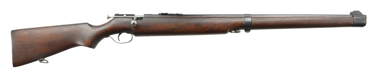 Cal. 22 LR. B2165. Bbl. 27". Mfg. Pre 1961. Single shot bolt action Cooey Canadian military training rifle. Mannlicher type stock cut square at muzzle. 2 Bbl. bands. Slotted blade front sight & elevation adj. rear. Mid & rear sling swivels. 34,810 mfg. for Canadian Government in 1944. This rifle is numbered B2165 on pistol grip w/ No "67" cartouche on action. CONDITION: blued finish on exposed surfaces remains complete & consistent w/ some thinning on high spots & in areas of mechanical intervention. Wooden stock displays scattered minor dents & impressions. Bright bore w/ strong rifling. Fire control mechanism appears to function correctly when cycled by hand. (22-571/JZ). CURIO. $200-400.