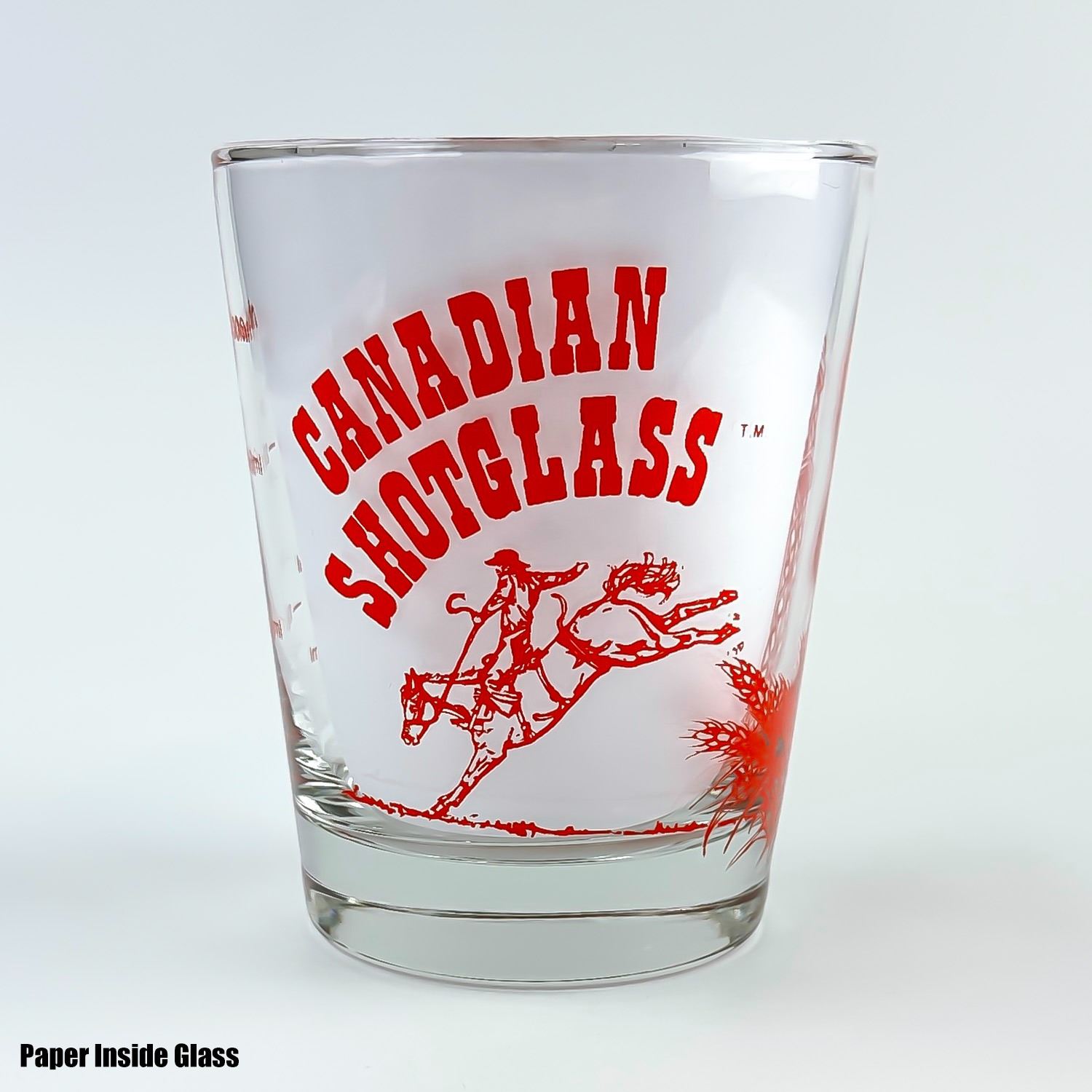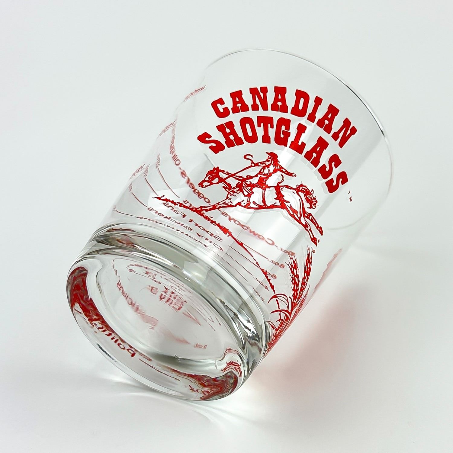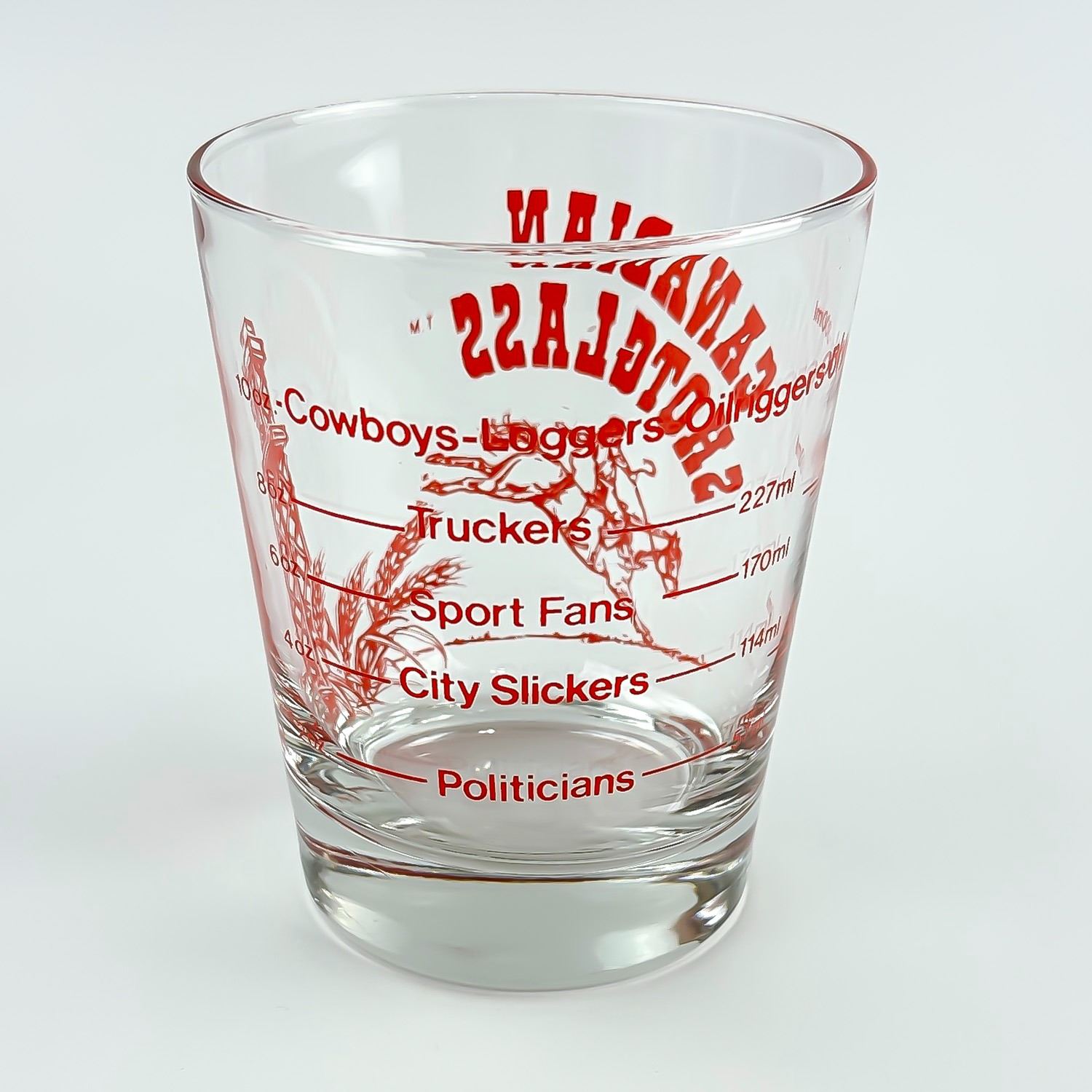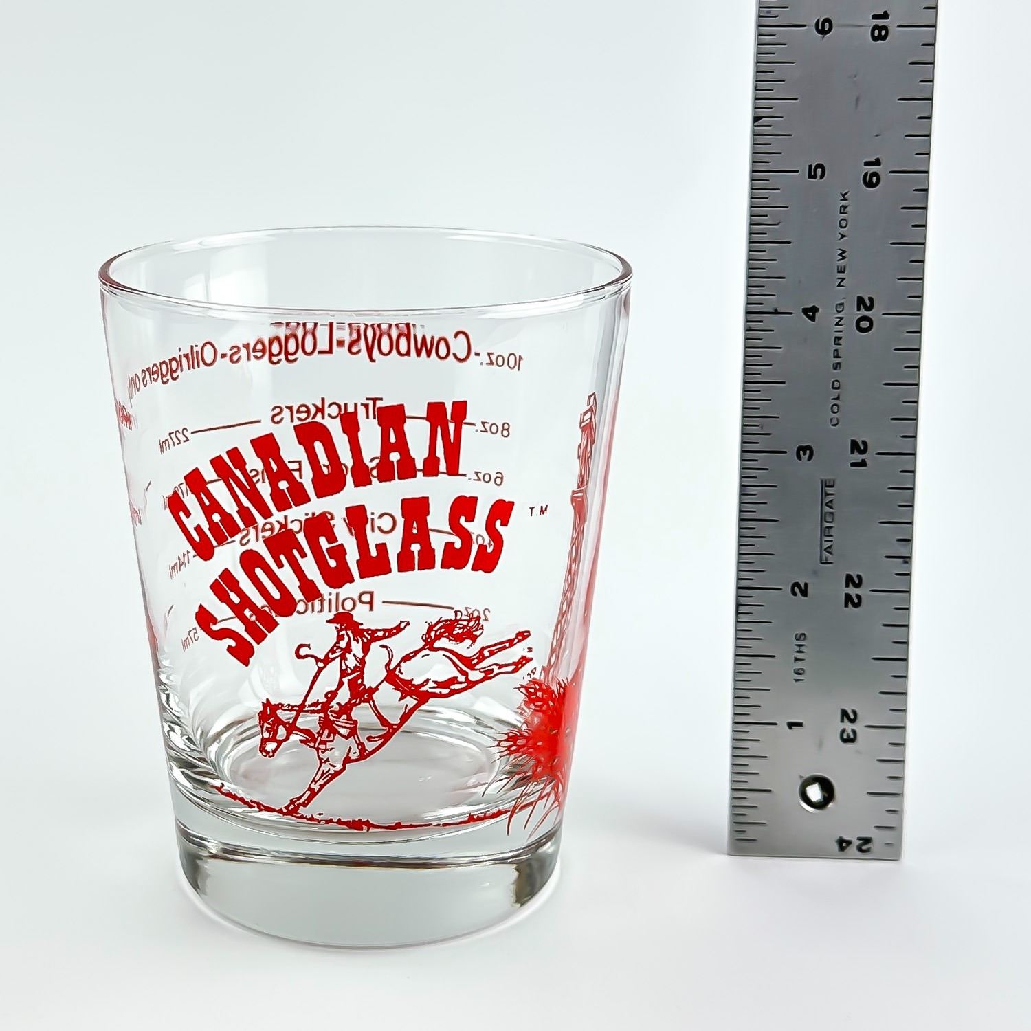#8849 - LARGE VINTAGE CANADIAN SHOTGLASS - 10 PLUS OZ. SHOT GLASS. COWBOYS - LOGGERS - OIL RIGGERS ONLY, AS WELL AS TRUCKERS, SPORTS FANS, CITY SLICKERS AND POLITICIANS. NO CRACKS, CHIPS OR REPAIRS. HOME OR BARWARE DECOR. MEASURES 4.25” (11 CM) TALL BY 3.5” (9 CM) TOP DIAMETER.