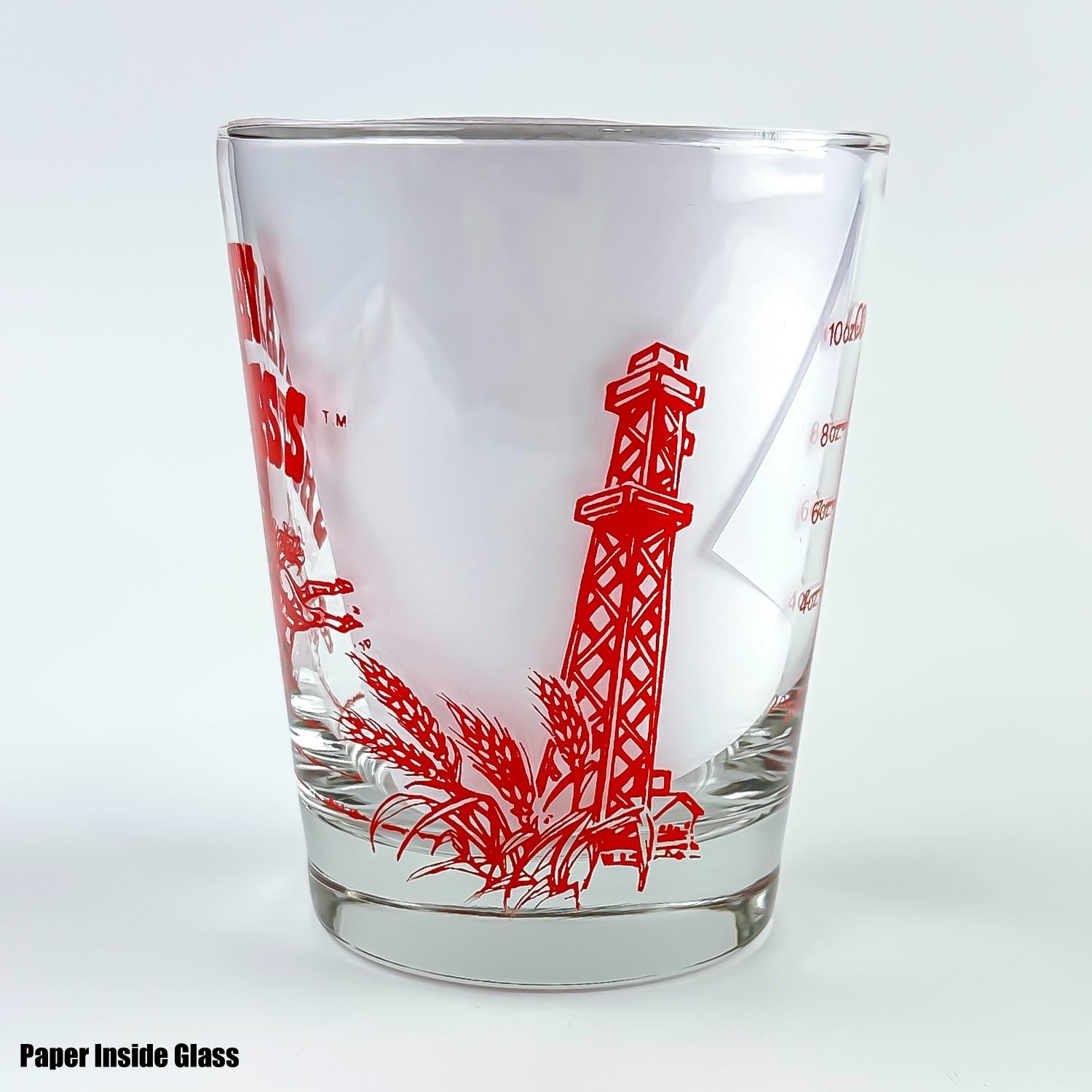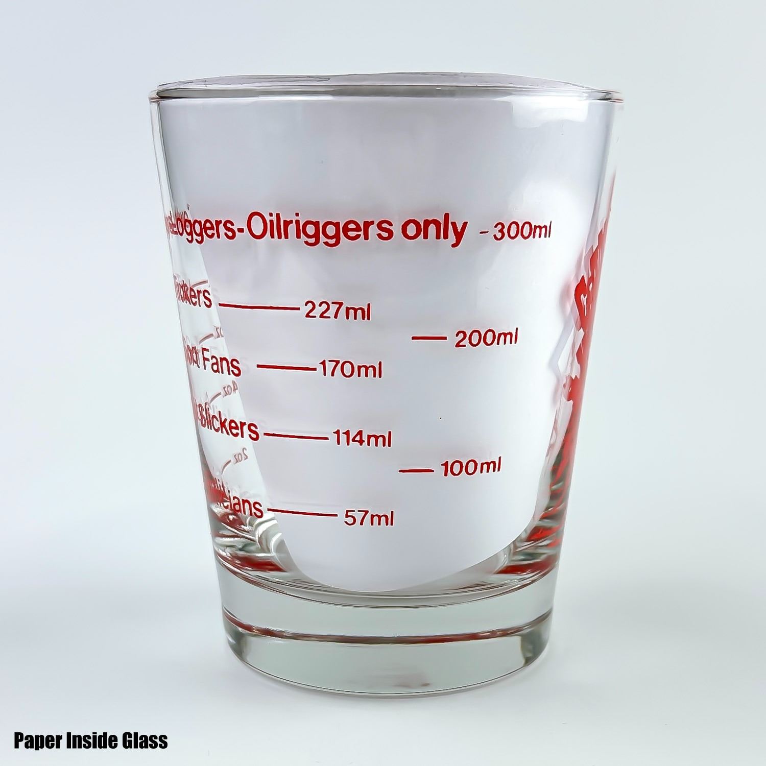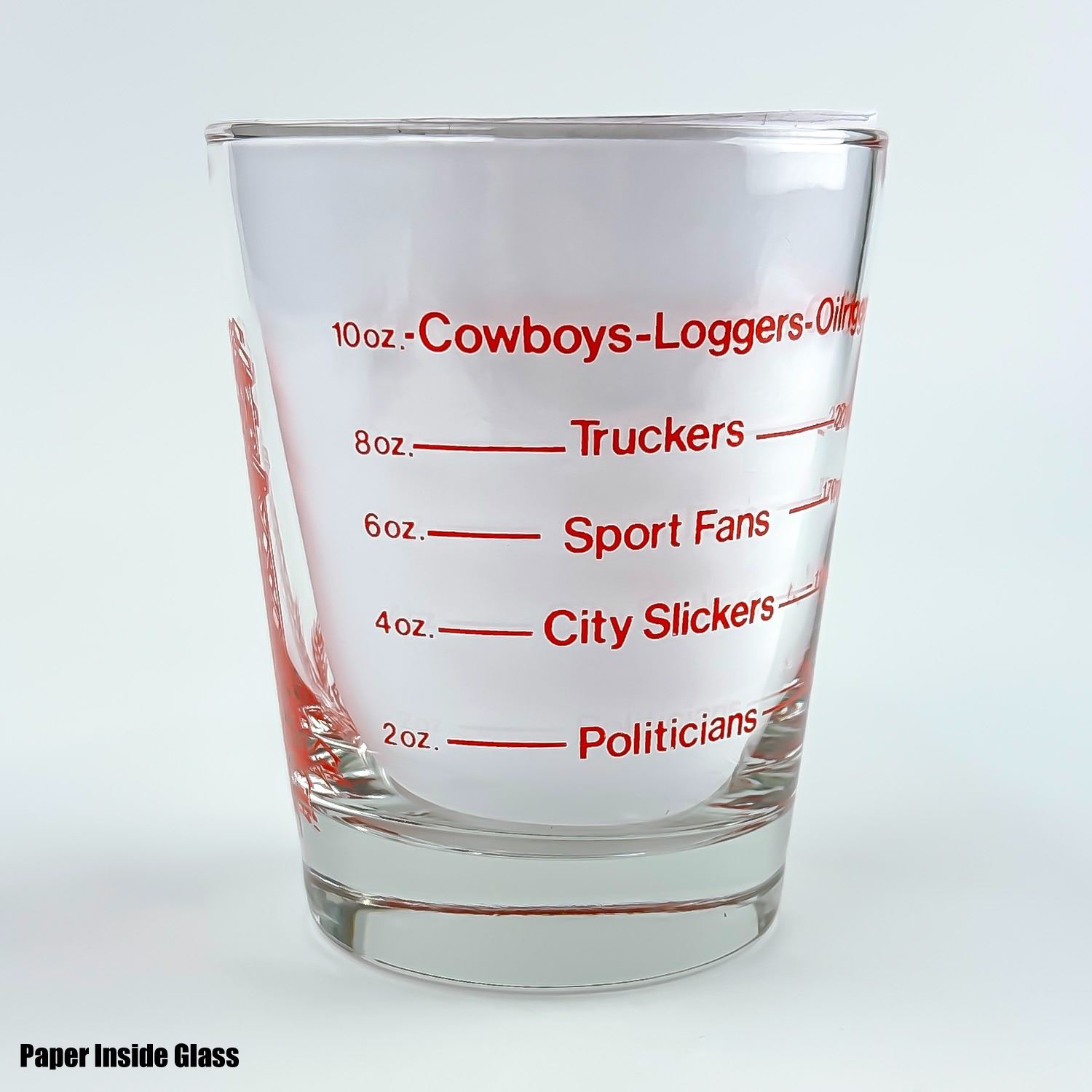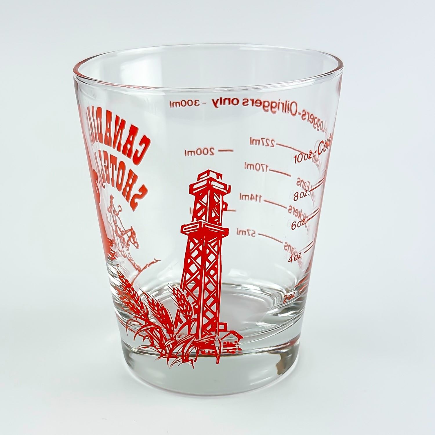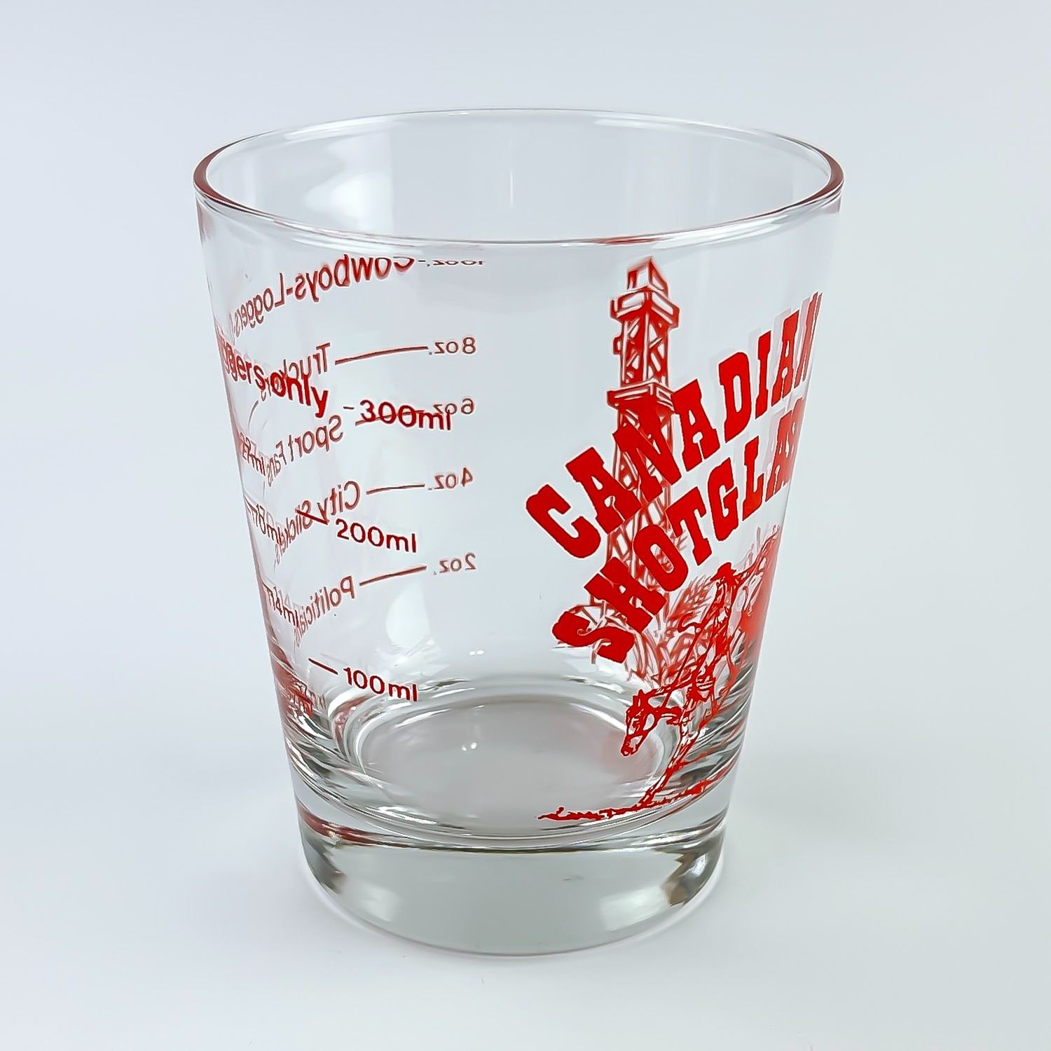 #8849 - LARGE VINTAGE CANADIAN SHOTGLASS - 10 PLUS OZ. SHOT GLASS. COWBOYS - LOGGERS - OIL RIGGERS ONLY, AS WELL AS TRUCKERS, SPORTS FANS, CITY SLICKERS AND POLITICIANS. NO CRACKS, CHIPS OR REPAIRS. HOME OR BARWARE DECOR. MEASURES 4.25” (11 CM) TALL BY 3.5” (9 CM) TOP DIAMETER.