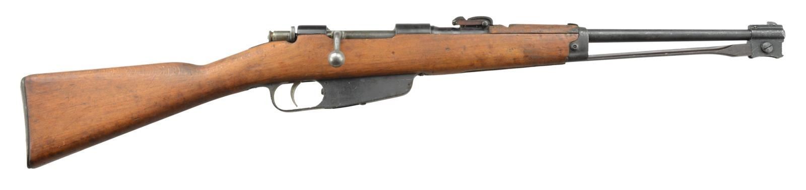 Cal. 6.5 Carcano. S# CAR17099. Bbl. 17 3/4" w/ band mounted front sight & 1,400 yd. graduated rear sight. Bbl. shank is stamped "FN-AB" over original number "Y03026". 13" Folding triangular bayonet. Two lug action cocks on opening & has stripper clip loaded box mag. Half length hardwood stock & handguard w/ iron trapdoor buttplate. Left side of stock at butt is numbered "Y0 / 3026". Leather sling on left side swivels. Left side of receiver is marked w/ "ITALY M.91 6.5x52MM / PW ARMS, REDMOND, WA" import marks. UNATTACHED ACCESSORIES: 3 stripper clips. CONDITION: 70% dull fading blue showing lots of surface corrosion. Stock has worn appearance showing numerous dents, scratches & marks. Bore is dark w/ worn rifling. PROVENANCE: from the estate collections of Charles P. Obremski. (22-1291/DS). CURIO. $100-200.