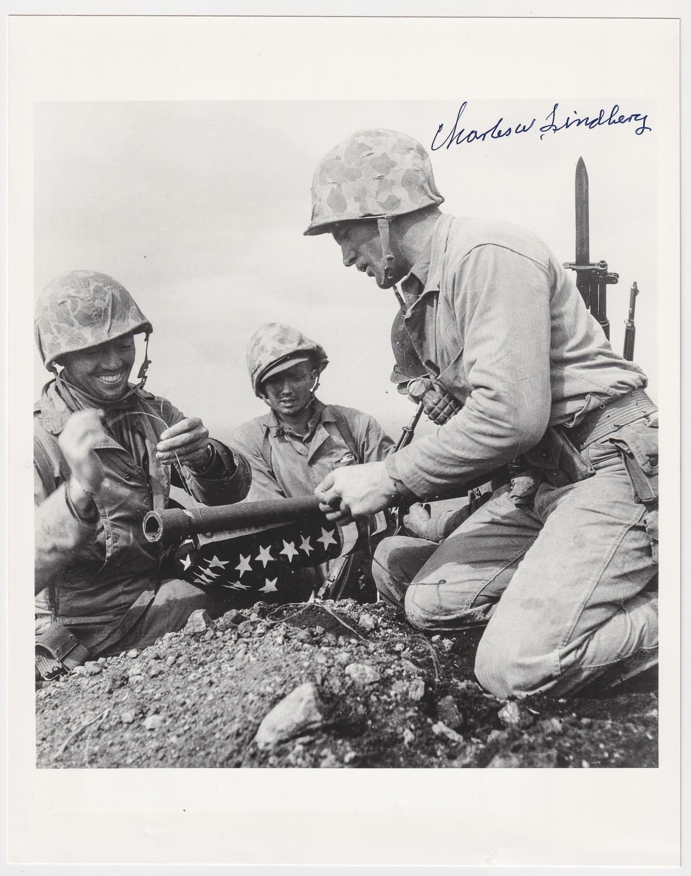 (1920-2007) United States Marine Corps corporal who was a member of the patrol that captured the top of Mount Suribachi and raised the first U.S. flag on the island on February 23, 1945. Signed in black ink, 'Charles W. Lindberg.' 8 x 10 inches.